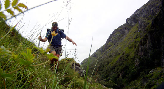 With an improved packing set up, I set off for the pass, no longer skirting the puddles and putting my weight onto the packstaff when needed. Taking it slow, I felt much safer with the staff as I plodded steadily up to the watershed. Here, still surrounded by boggy the steep valley sides, a faint sheep trail descended steeply to a water-logged valley where it disappeared altogether. Even with a staff and wet-proof feet, the valley still took some negotiating, inching around outcrops while leaning on the firmly planted staff which would have pretzeled a Leki walking pole. In the end, it was simpler to follow the stony river bed.