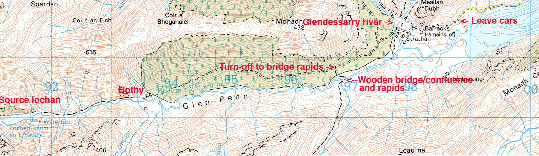 Back at the bothy, I was satisfied with my recce. The upper Pean was navigable with a little effort for about 4kms from the bothy to the bridge, but at the bridge you’d need to pack up and haul up a messy track into the forest and walk on down to Strathan, or stagger along the banks until the river cleared up. (I’ve since returned and paddled the Pean from that bridge down to Loch Arkaig).