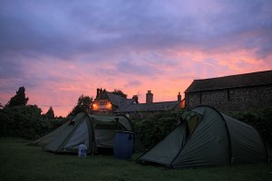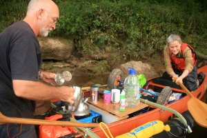 Our first night was spent just above Monnington Falls. It’s a muddy scramble up a bank till you reach some steps, then an orchard campsite with a decent shower at the far end. Having a light boat is a big advantage here, though a plastic canoe could be safely tied up and left by the river. A nice spot and you can worry yourself all night about how bad the falls might be next morning. In the event, the water levels were so high that the falls were submerged and the only trick was to turn fast enough to avoid being tangled up in trees in fast water.