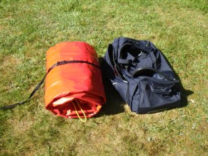 Let’s begin at the end: rolling up the K40. I followed the instructions provided in the leaflet. I removed the footrest airbag and the thigh braces before rolling the boat up and it took one or two attempts before I managed to roll the boat exactly as on the leaflet picture. The resulting bundle (right) was a bit thicker than my Grabner H2, but a bit shorter and I could put it back into the wheel bag provided by Sea Kayak Oban without any trouble.