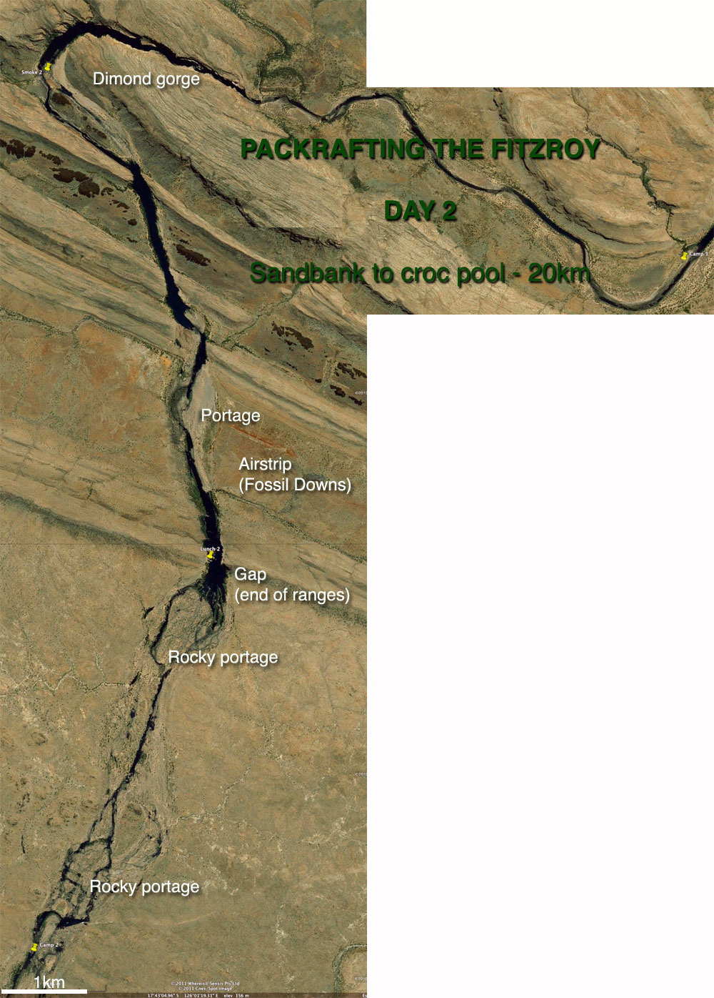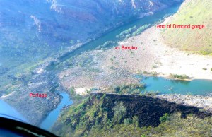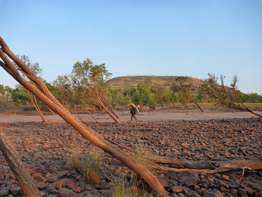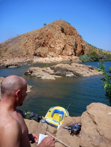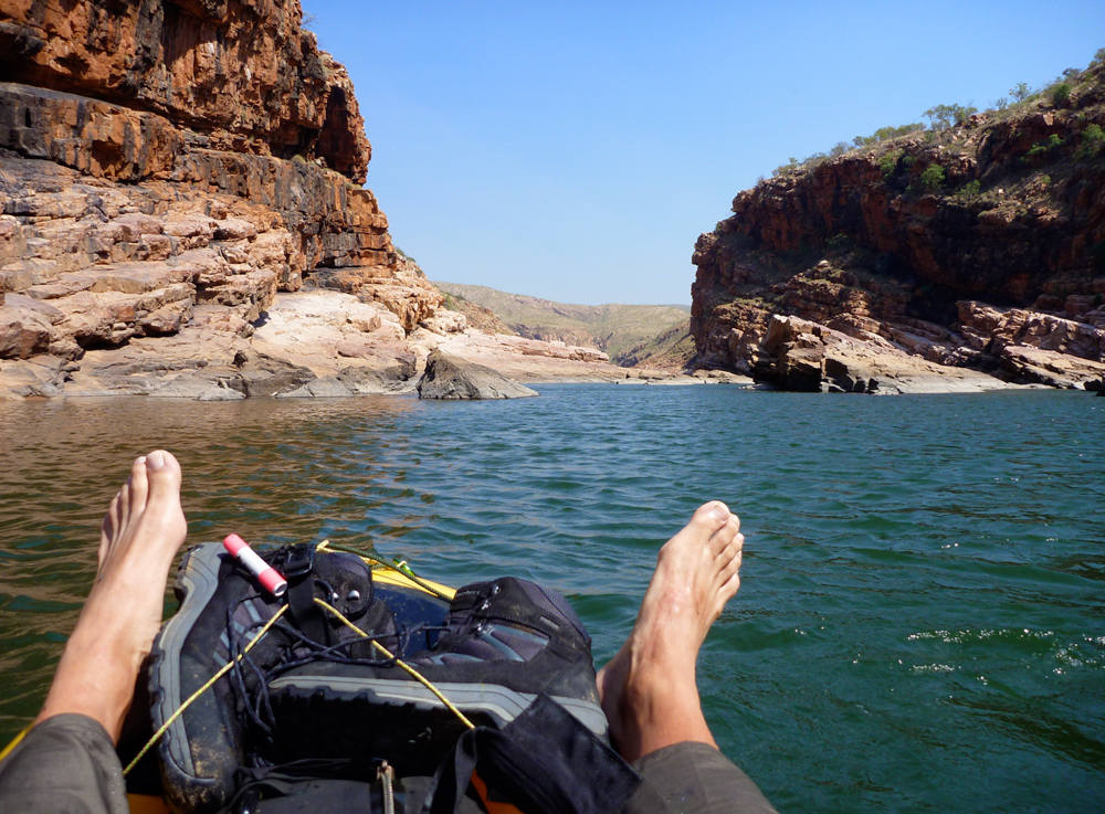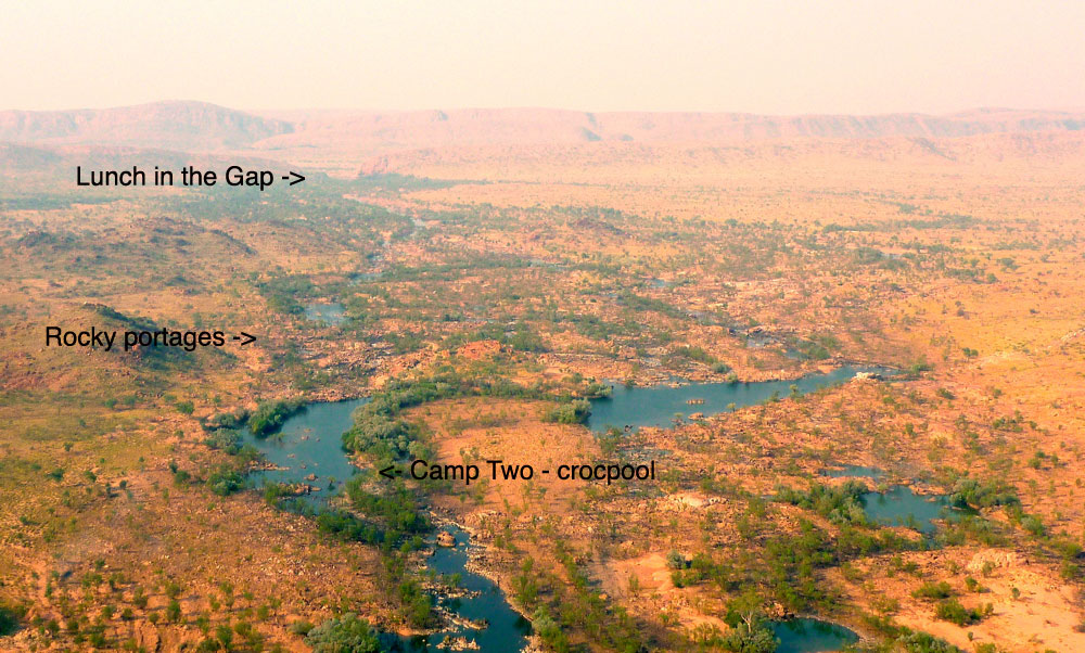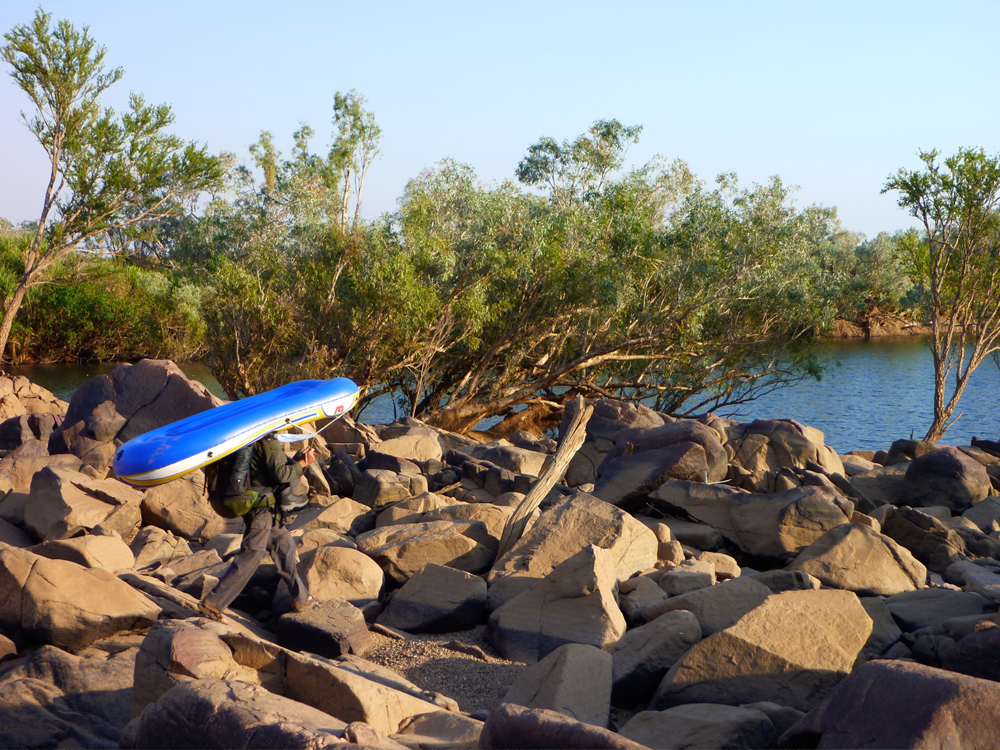From this point it was about 6km to the next landmark – what we called the Gap, an opening in a low ridge like those found in the West Macs out of Alice, and which here marked the southernmost ridge of the King Leopolds. We’d seen it clearly on the flight in and with the headwinds persisting, Jeff decided to head off across the boulders while I paddled on for a couple of minutes, then portaged a very gnarly section. It looks like an easy 5-minute walk on the aerial picture but let me tell you with the head wind and my unstable pack, stepping between fridge-sized rocks with a boat under my arm was not a dance the Royal Ballet will be performing any time soon. At least the Brasher trail boots both Jeff and I had bought cheap in London were earning their keep here. Out of the shade and off the water, the heat bounced off the rocks, sapping the energy expended in carefully negotiating these rocky portages. I’d have to come up with a better system like Jeff, if these rough portages were to continue downstream.
