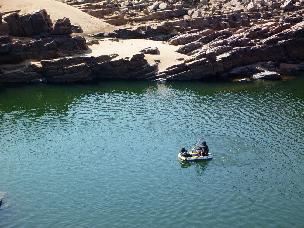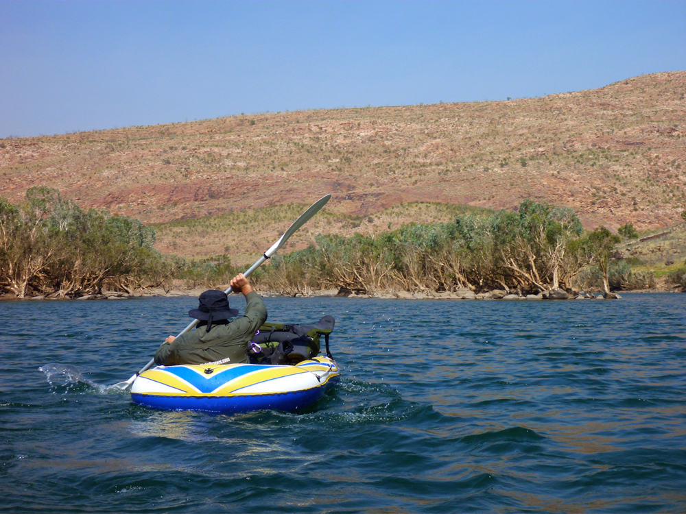 Like us, in the cool of the morning both boats were a little flaccid after yesterday’s exertions, but Jeff was relieved to find his Bestway was still holding good air. Even then, after a brief paddle he decided to walk the remaining five kilometres to Dimond Gorge. Me, I was pleased to stay on the water, even if it occasionally meant skating across slime-covered rocks when dragging the boat through shallow rapids (left). Right along the length of Fitzroy, another six inches water and just about all rapids could have been run in our boats, but I don’t suppose it works like that.