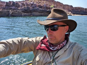 Jeff was now out of sight somewhere in the woods and soon enough the flow got shoved off the main channel by a blockage to burrow into the fringe canopy of trees where birds twittered and water monitors glared. This benign riverine underworld was a habitat I’d not anticipated, but was one of the most pleasant environments we found on the Fitzroy. Like a Damascene souk, shaded from the heat and glare of direct sunlight, you felt protected, cool and soothed while cockatoos squawked, rainbow bee eaters darted ahead and lanky-necked egrets stalked the pools. While pushing, pulling or paddling the boat through these cool causeways, I was reminded of that cool picture of Ed Stafford hauling his heavily loaded Alpacka through the Amazonian swamp.