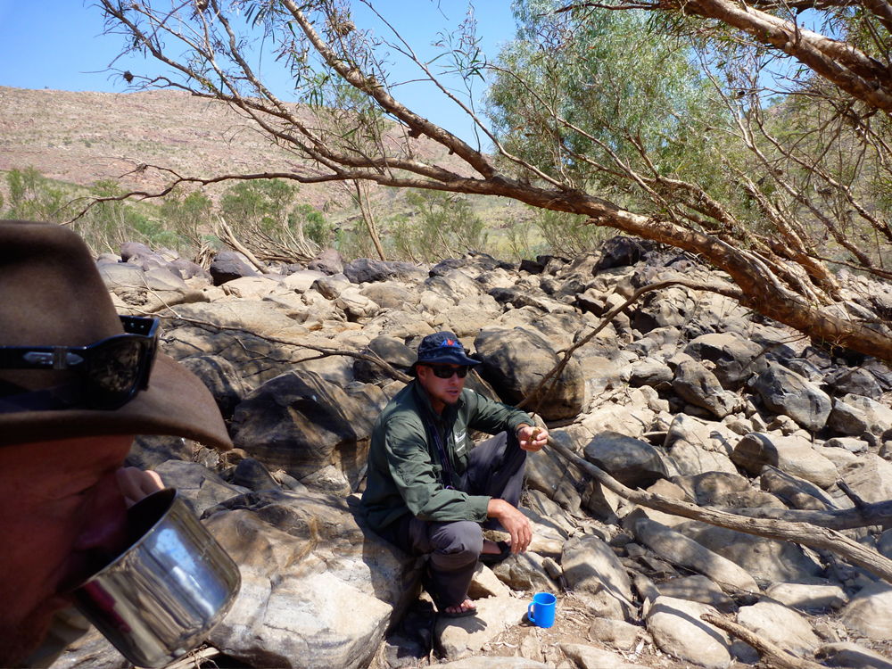 It was already 10am and with 8 or 9 clicks behind is, it was high time for ‘smoko’ as they call it in out here. As always, firewood was within arm’s reach and soon the billy was on the boil. We’d brought a gas stove in case high winds made real fires risky; on the way in from Broome we’d seen several roadside fires. Most were deliberate, late-season burn-offs, but we’d also heard some ultra-marathon racers had been trapped by a bushfire in a gorge on El Questro near Wyndham and had been very badly burned. If nothing else, it would be extremely bad form to start a bushfire on the station land we were about to cross, but we always lit up alongside the river where things remained damp and cool.
