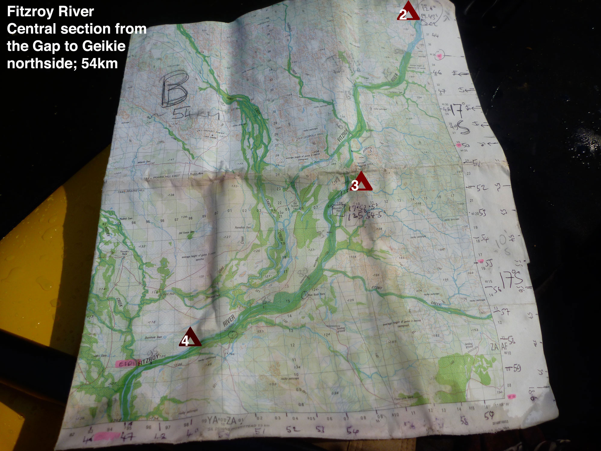 Three 1:100,000 scale maps covered out route and proved to be very accurate, considering the river channels can move around after a Wet.
