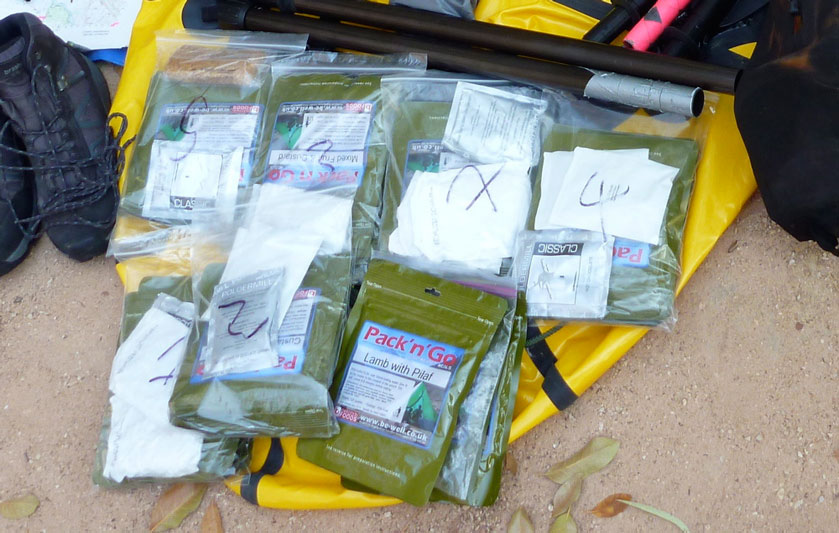 We brought a week of freeze-dried, Pack n Go food from the UK (below left) which weighed in at 3.5kg each but didn’t cover lunch – just hot choc, breakfast cereal and a two-course dinner. Pour in boiling water, seal, wait a few minutes and you got meal. Although it became quite boring after a while and some meals are tastier than others, I was amazed at its ability to sustain us considering the energy we were expending for up to 11 hours a day. I probably ate half what I do at home merely bashing at a keyboard; I suppose the heat helped suppress the appetite, but it must have also been due to the food’s calorific and nutritional values.