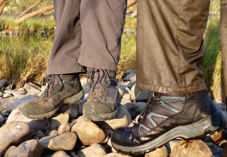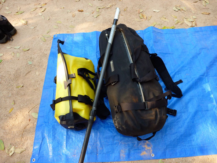 I expected to need to cover right up to reduce sun burn and transpiration: long trousers, long sleeves and a hat. But in the end while the UV was the same, it was not so hot on the river due to splashing and shade, and the trousers were only useful against big flies in the gorges on day one. The problem with long trousers is that when wet they cling to your legs and drag – Jeff eventually ripped his North Face zip-offs above the knee, but both if us turned to shorts and a bit of slip-slap-slop on our legs. Rolling up the trousers didn’t quite work.
