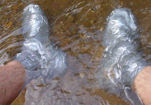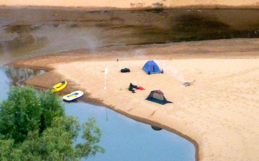 We both bought some Brasher Lithium boots which were going half price in London (£65), as we expected a lot of tough walking with full loads. In the end there was very little of that – and just as well in the heat away from the river. The Lithiums were great when portaging/balancing over boulders and wading through slimy, rocky shallows. But in the sands they filled up with grit and were hard to drag out of quicksands where they filled with sand all the more. Jeff who did more walking than me, wore his Lithiums more, or his Tevas, but in the end we both went barefoot in the river: lighter feet, easier quicksands and more hygienic. By the end our feet were a little sore and swollen from rough gravel, very hot sand and twig jabs, but I think Jeff found his Tevas the worst of both worlds for catching gravel on his already sore feet while not giving full boulder support or secure footing. On the last morning he duct-taped his shoes to his feet (left), but that didn’t really work either. Around camp I wore flip-flops.