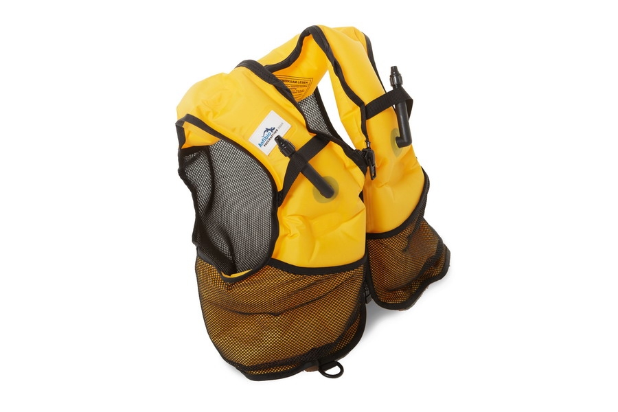 Back in 2015 the Packrafting Store in Germany sold us a couple of pre-production Anfibio inflatable packrafting vests to try out. These came without the big mesh pockets, unlike the current production item, left.