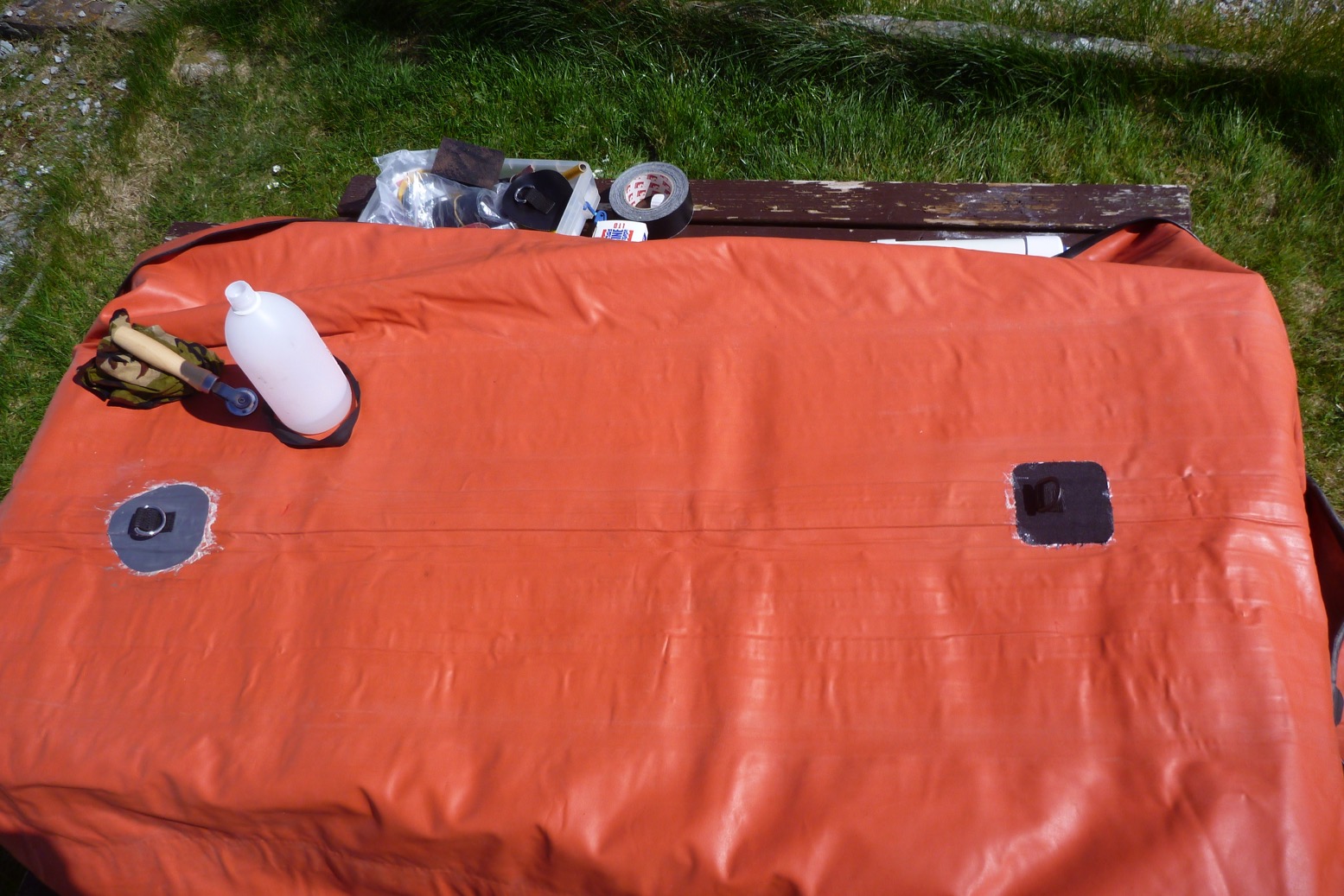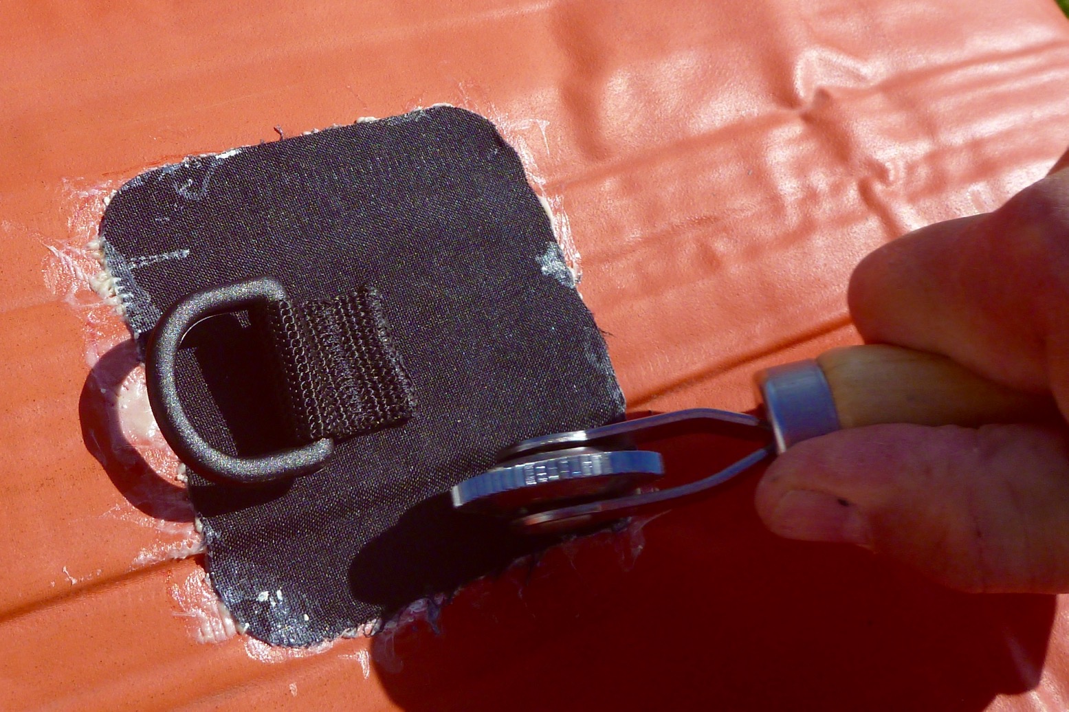 With glue left over, I thought I may as well stick on couple of floor patches for a seat base and a footrest tube. As these are non-critical fittings I used any old D-rings I had: a woven nylon one and probably a PVC. I’ve glued PVC to hypalon before for other fittings.