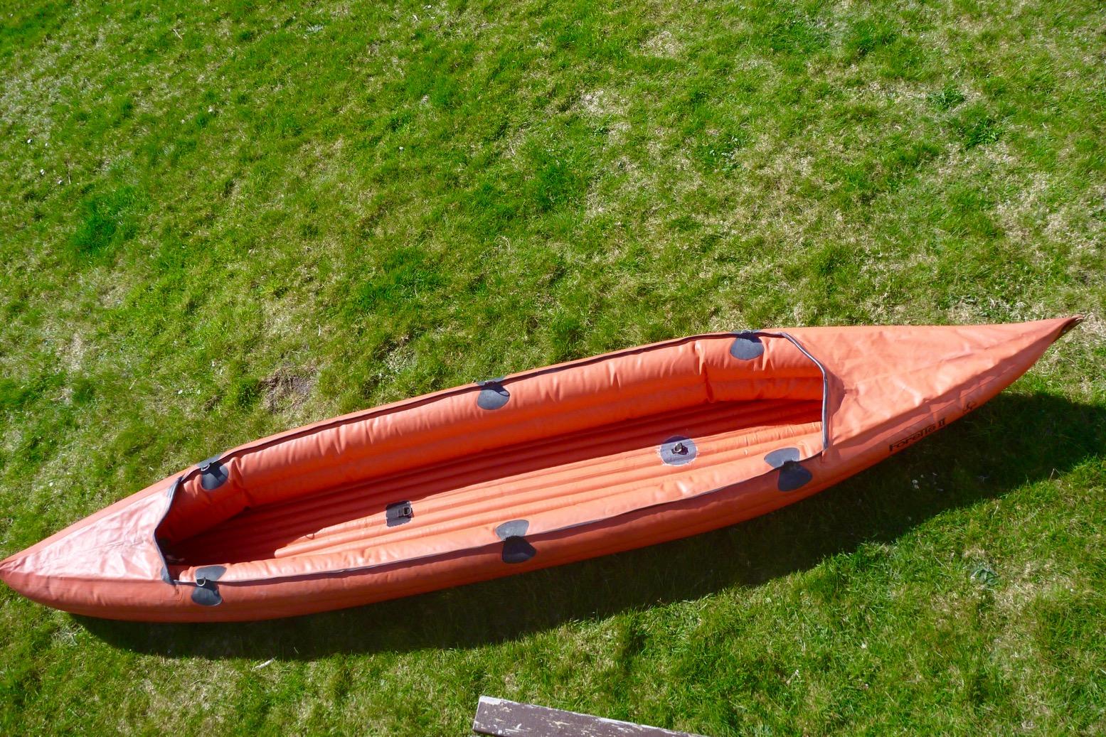 Looking round the repaired boat I see it has rudder mounts; not sure I’ll need one on a 3.56m boat. There are six D-rings on top of the double side tubes but they don’t look like they’ll take the backwards strain of a fabric backrest Forelles came with wooden backrest bars, (like Grabners who took over Semperit) and which I’ve found prone to bending when used with a firm footrest tube.