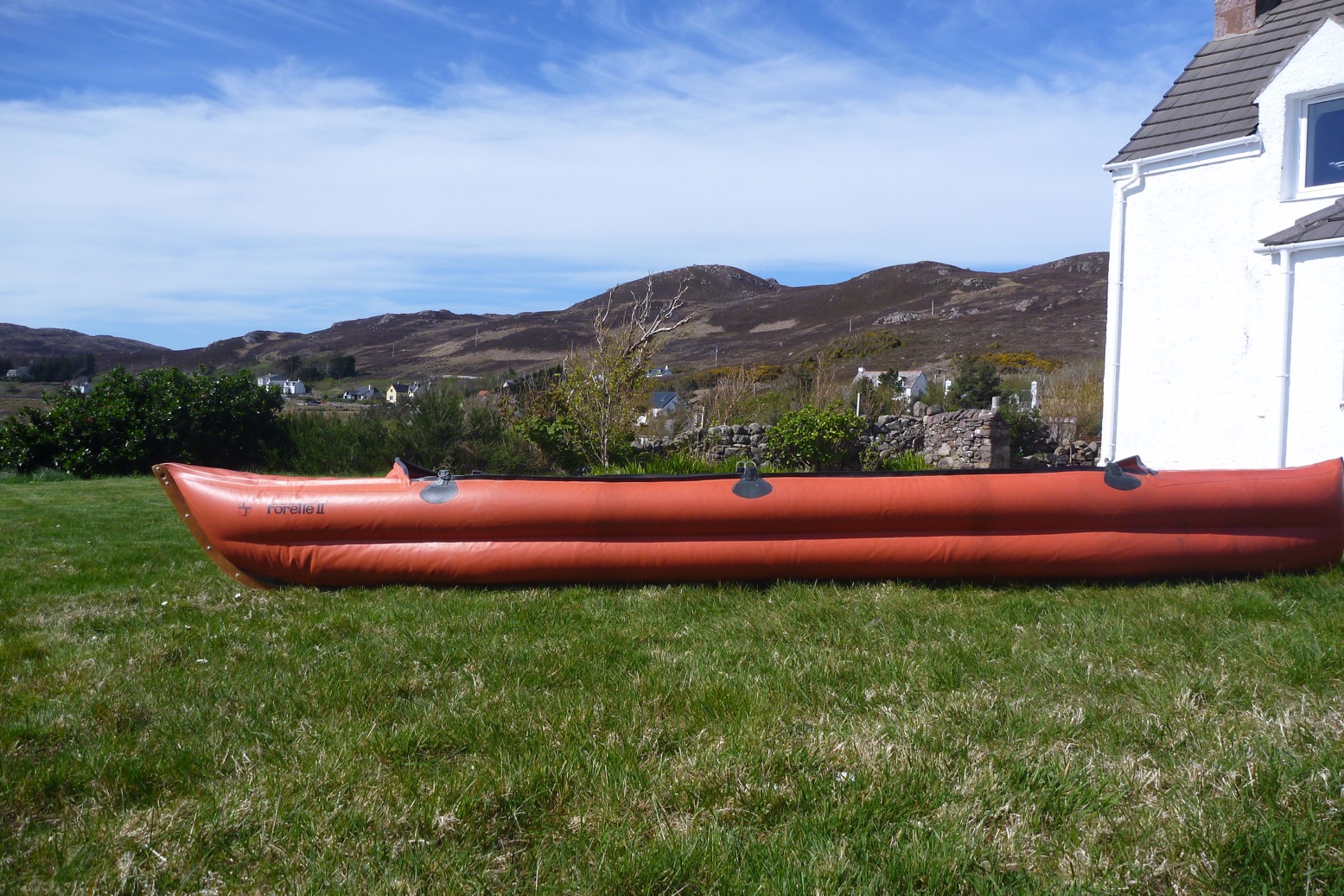 There’s also a squished up full-length keel strip along the bottom. If it works for tracking it will be nice not to have the usual skeg-grounding aggro in shallows or on land. But maybe that keel will slow down turning which is why they have the rudder attachment? We shall see. With twin side tubes the Forelle is just 70cm wide – that’s <28″. But with a thin floor and me sat low in the high sides I’m sure it will be stable enough.