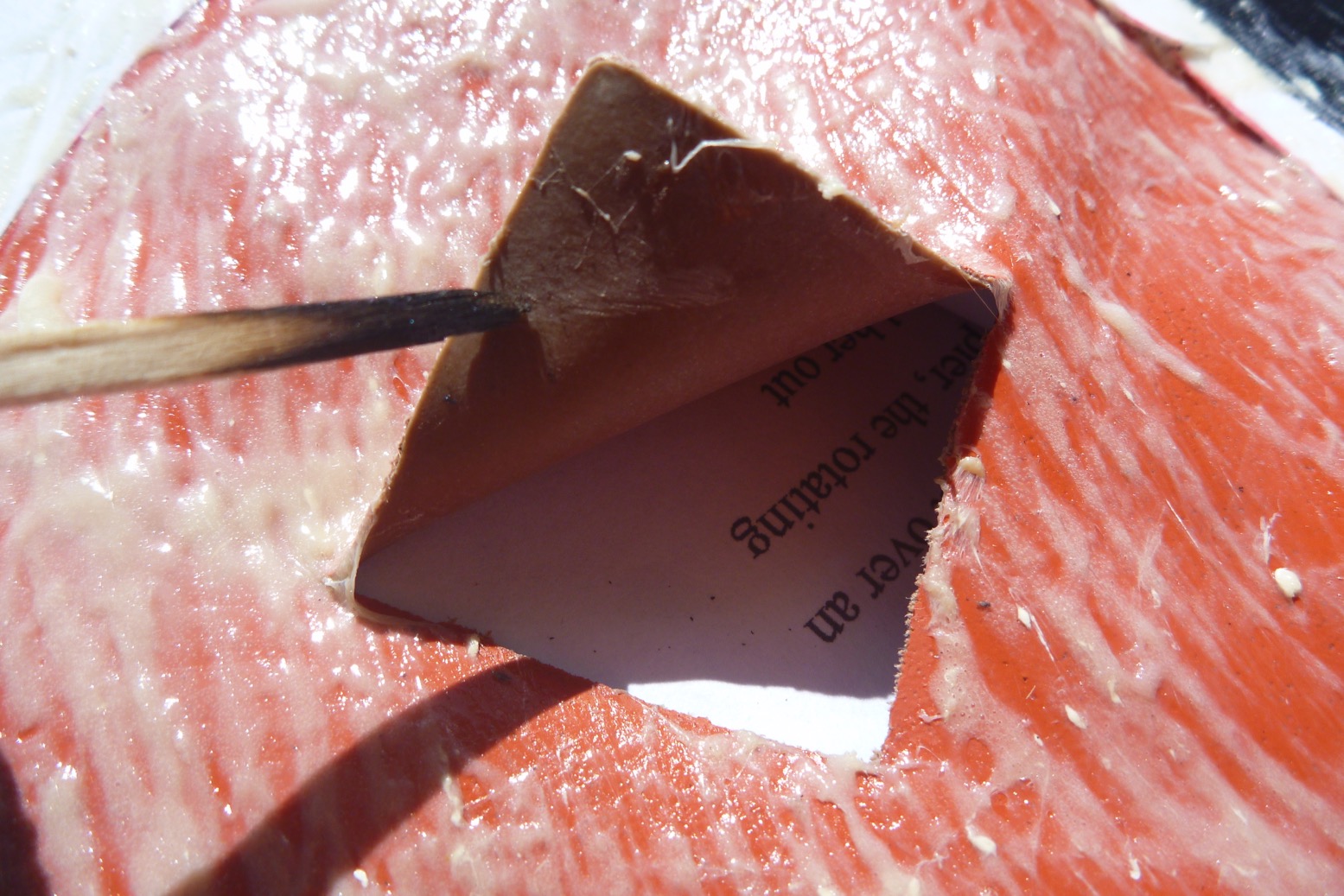 Just before I did that, it occurred to me stray glue may squeeze through the tear and glue the insides together. Don’t want that nein danke so, with no better ideas, I stuck a bit of paper in there. Seems to have worked.