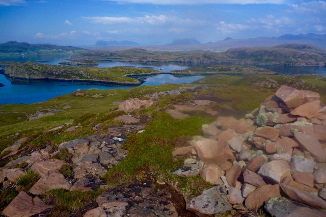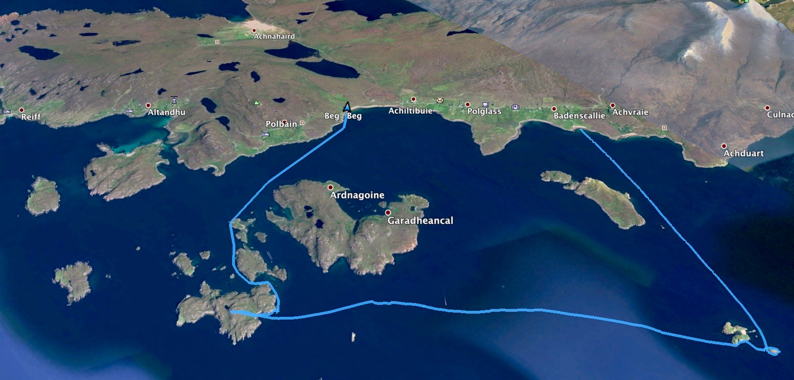 From Badenscallie I went south past Horse Island and Iolla Mhor to Carn nan Sgeir, a quick loop around Meall nan Caolach, just a mile from the south side of Loch Broom, then right across to Tanera Beg to revive the legs with a walk up to the summit, and finally back to Badentarbet. Noticeable is the lack of fatigue when there’s no wind or waves to cut through. I’d have been more tired walking the same distance. A few days and a bit more wind later, I did a 14-km lap round Tanera Beg and was pooped.
