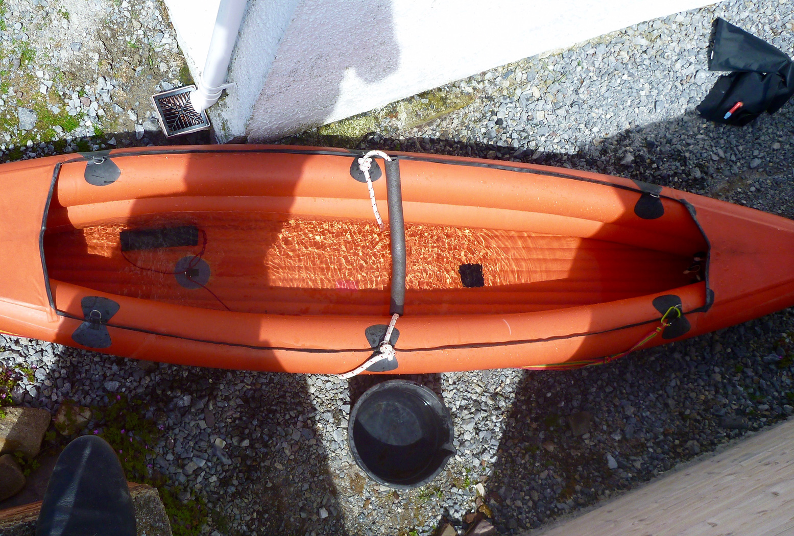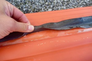 A couple of days after trying out the Semperit I noticed a scratch on the hull bottom (left) so decided to pre-emptively patch that with Bostik 1782 (less faff than 2-part). It looked like an old scratch which had opened up by reusing the boat.