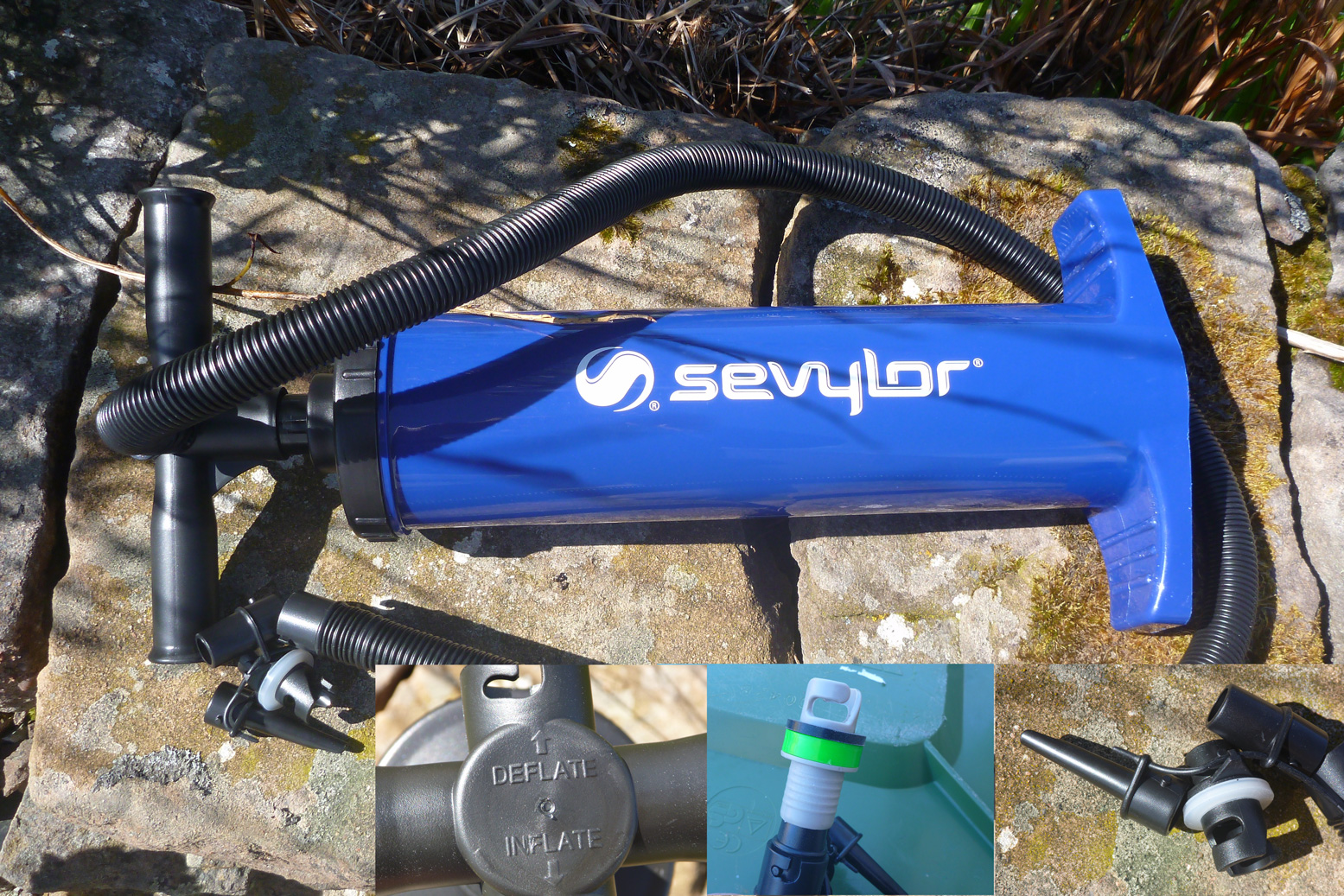 I left my Bravo 4 RED at home one time so bought a Sevylor RB2500G barrel pump (below left) for a tenner. Same size as the Bravo barrels, it did OK for the awkward topping-up of my Semperit’s lilo plugs and came with others adaptors plud sucked as well as pumped. But pumping up my Seawave from flat was exhausting towards the end: I actually got out of breath and had to rest! Morale of this fascinating anecdote: get a Bravo 4 RED and the right adaptor for your boat.
