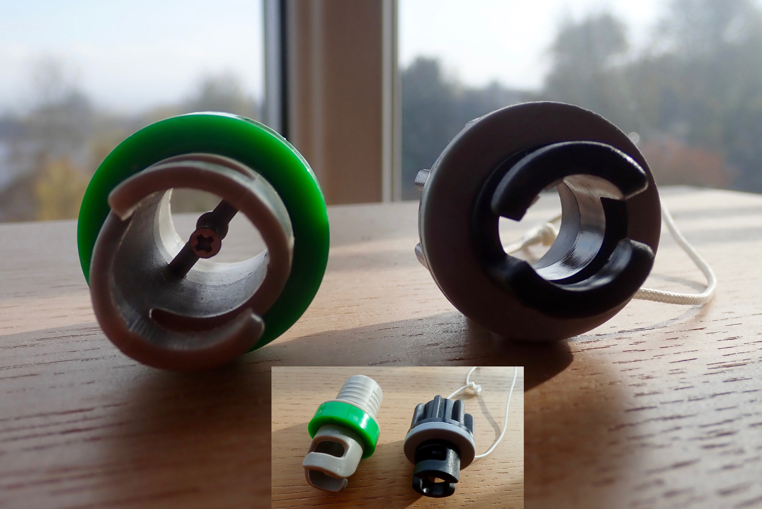 Who would have thought there’s something to be said about bayonet nozzles? Well there is. There are two types: plain (below right, Gumotex) and crossbar-peg or detent (left, Bravo). Both need soft spacer washers to fit snugly against your boat’s raft valve, but the small peg inside the green one will press open your valve stem as you connect it.