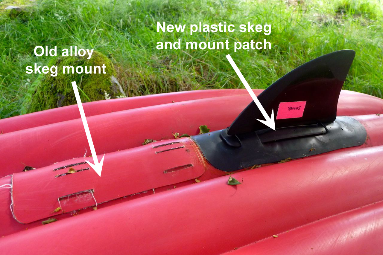 A modern plastic skeg needs a different patch but I bet there’s a way to adapt the alloy patch to take a plastic skeg. Below, a picture of new and old skegs on our old Solar 300.