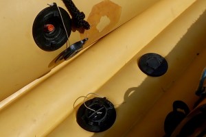 Unpacking, the Sunny was covered in damp sand and with the valves open. Some people just don’t know how to look after their boats! A quick hose down and it looks in great shape, less faded than my Seawave. Some of my old D-rings applied with crappy Gumotex glue have come adrift and there’s UV-discoloured factory glue at the seams, but the colours are still pretty bright and no seams are lifting.
