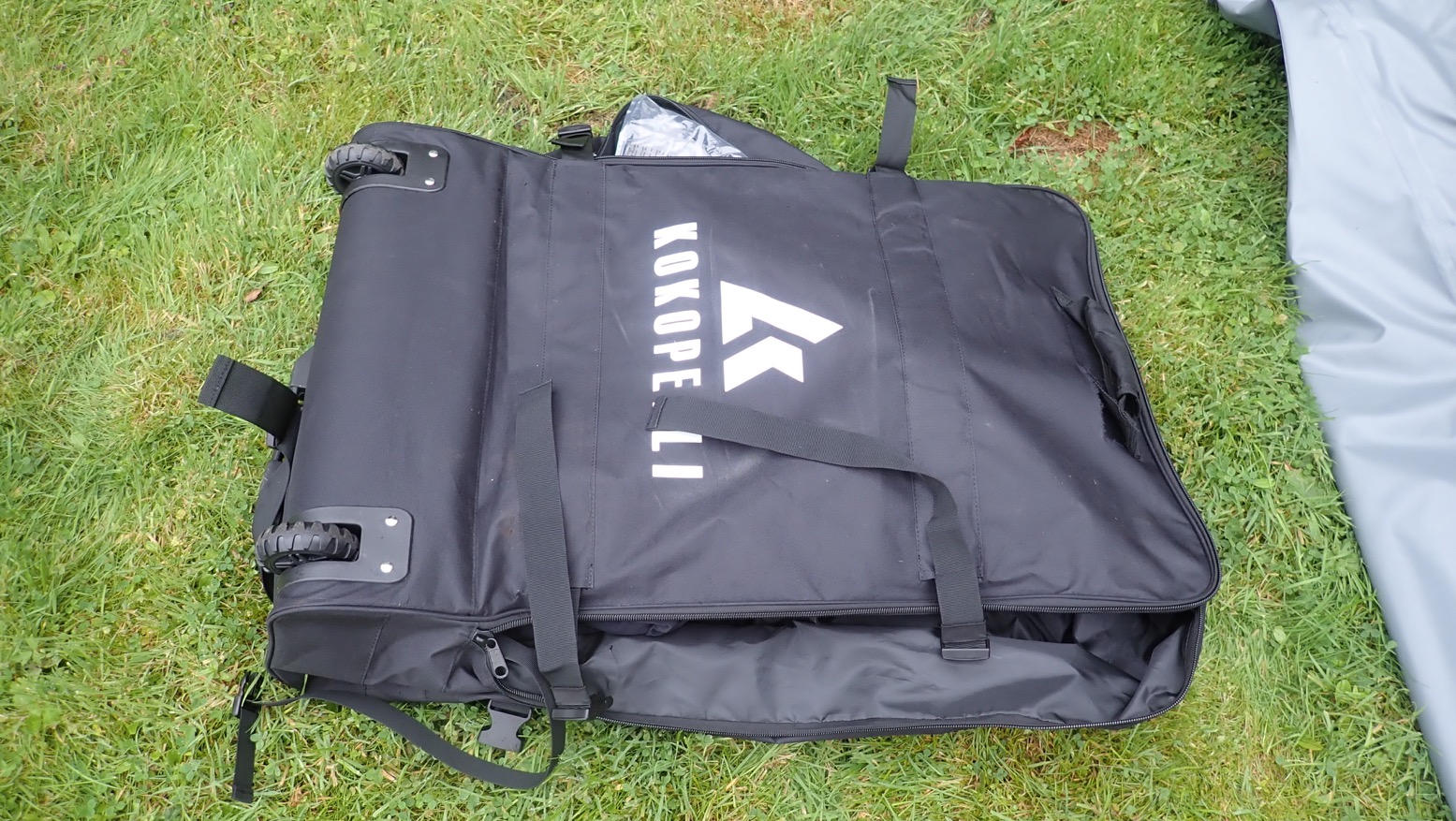 Your ‘premium carry bag’ is a giant roller suitcase with a rather optimistic backpack harness which, on this unused boat, the pulling handle had already ripped away. The bag weighs 27 kilos with everything in it and once you start unpacking, stuff just keeps coming out: hull, floor, pump, footrest, tandem deck, spray skirts and coaming rods, a skeg and a repair kit.