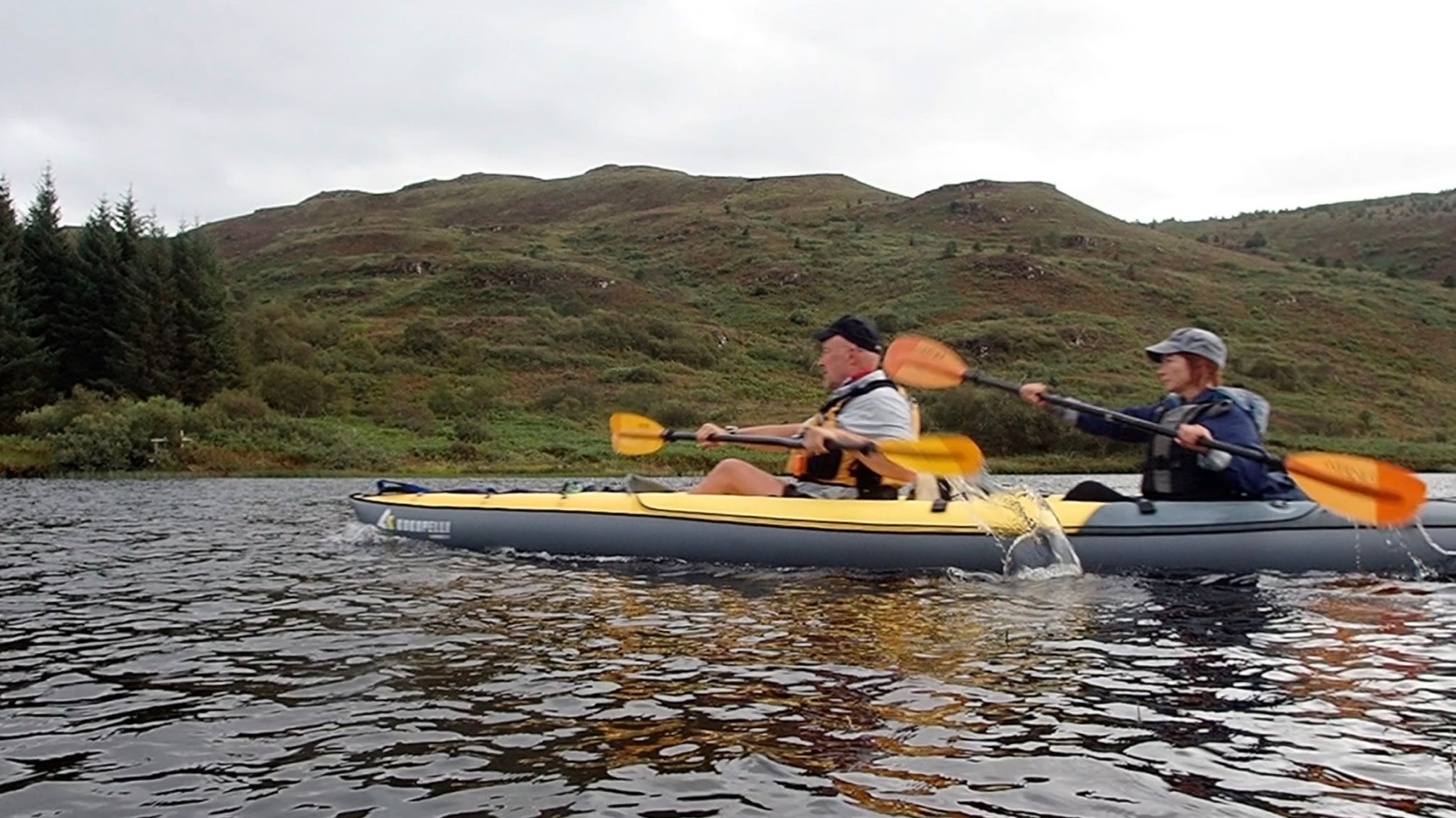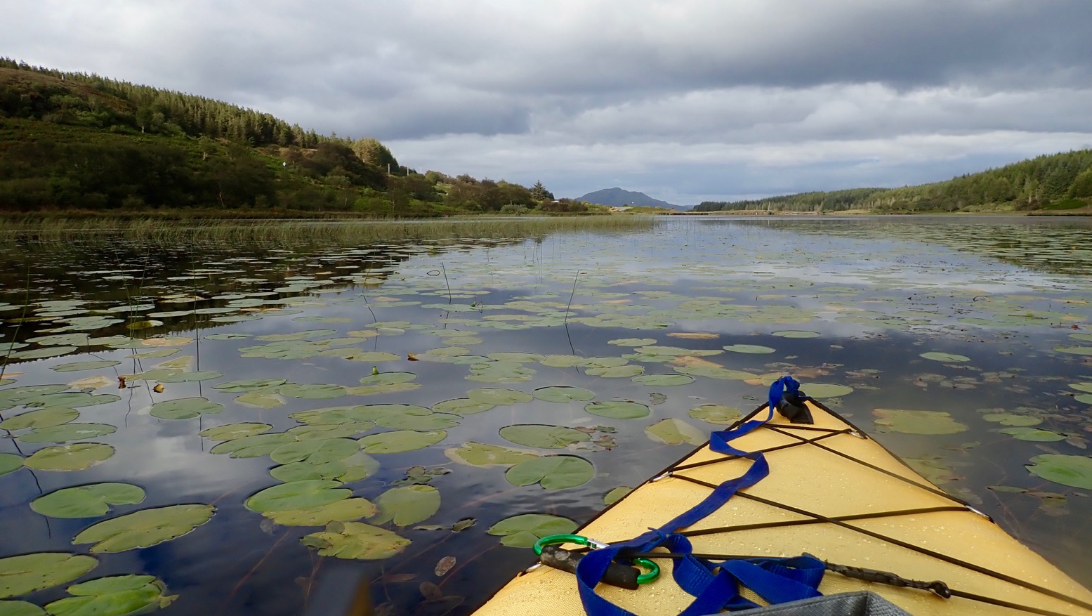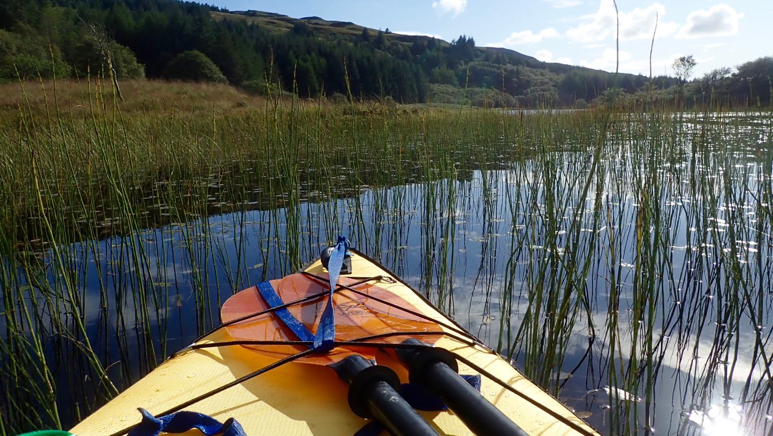 We scooted through the reeds which whined like sirens against the PVC hull, then passed under a rickety wooden bridge to the middle loch. This led to another reedy strait into the last loch above Tobermory and a view towards what was probably the 528-m flat cone of Ben Hiant over on Ardnamurchan. The sun came out, the sun went in and eventually the little camera’s batteries died after too much videoing.