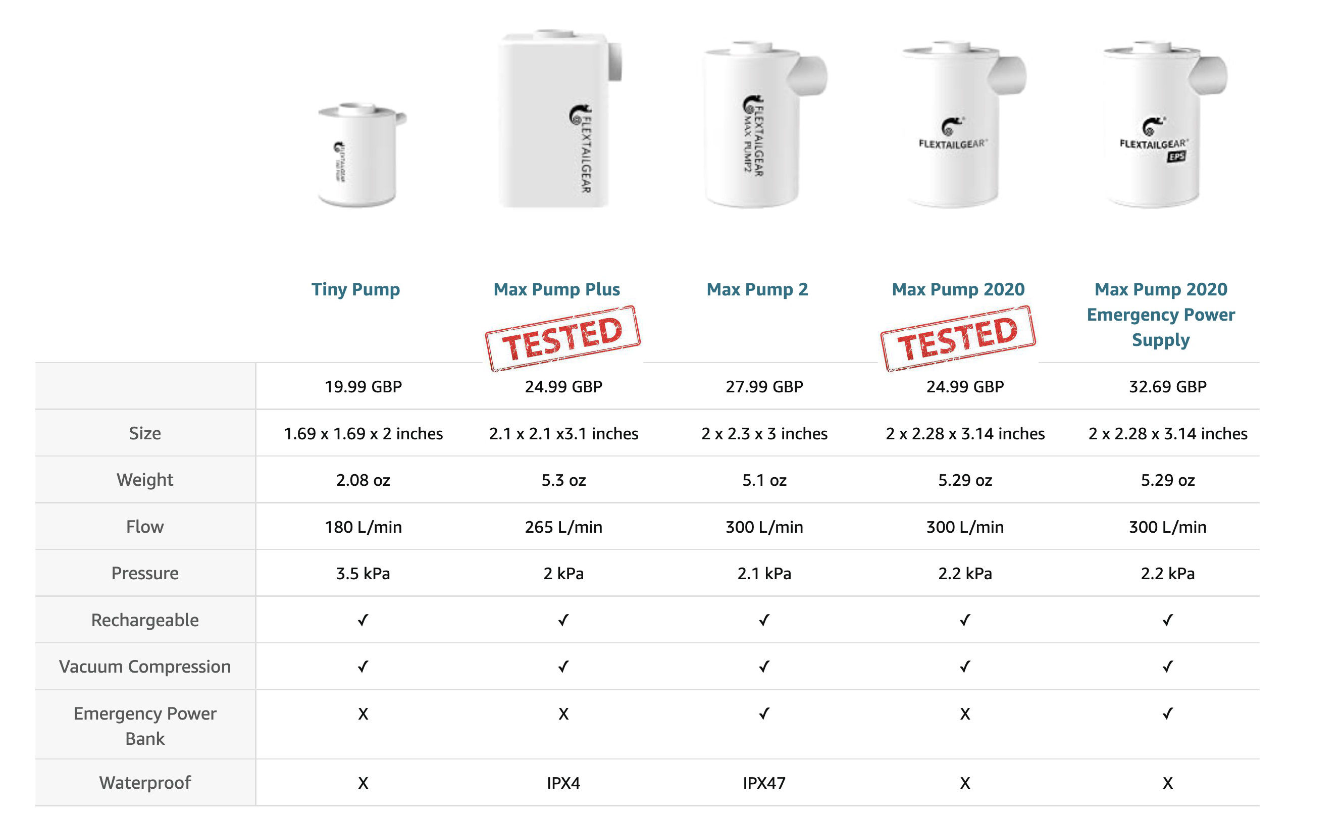 The Max 2020’s 3600mAH lithium battery is claimed to run for 40 minutes, so that ought to do at least 10-15 raft fills plus a few mats, when camping. I imagine the Max Plus will be the same.
