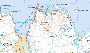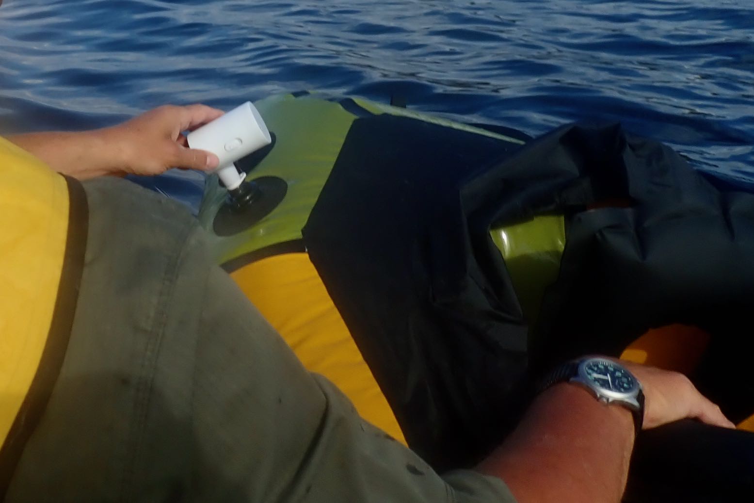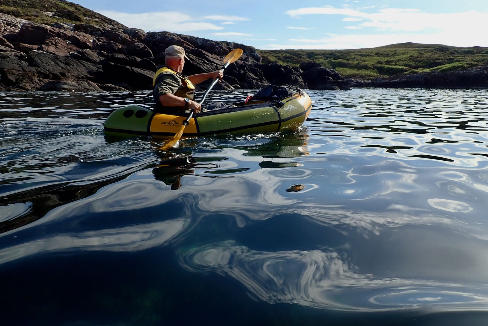 A light NW breeze blew onshore as we cut across Achnahaird Bay like a blue fin tuna. The approach of HW meant we slipped through the submerged skerries of Rubha Beag and into the crab’s claw inlet of Camas a Bhothain (Bothy Bay). This seemed a good spot to deploy the packraft with the aid of my exciting new gadget, a mini electric pump. I unrolled the boat over the water and let the pump buzz away for a couple of minutes, topped off with the hand pump, then clambered aboard.
