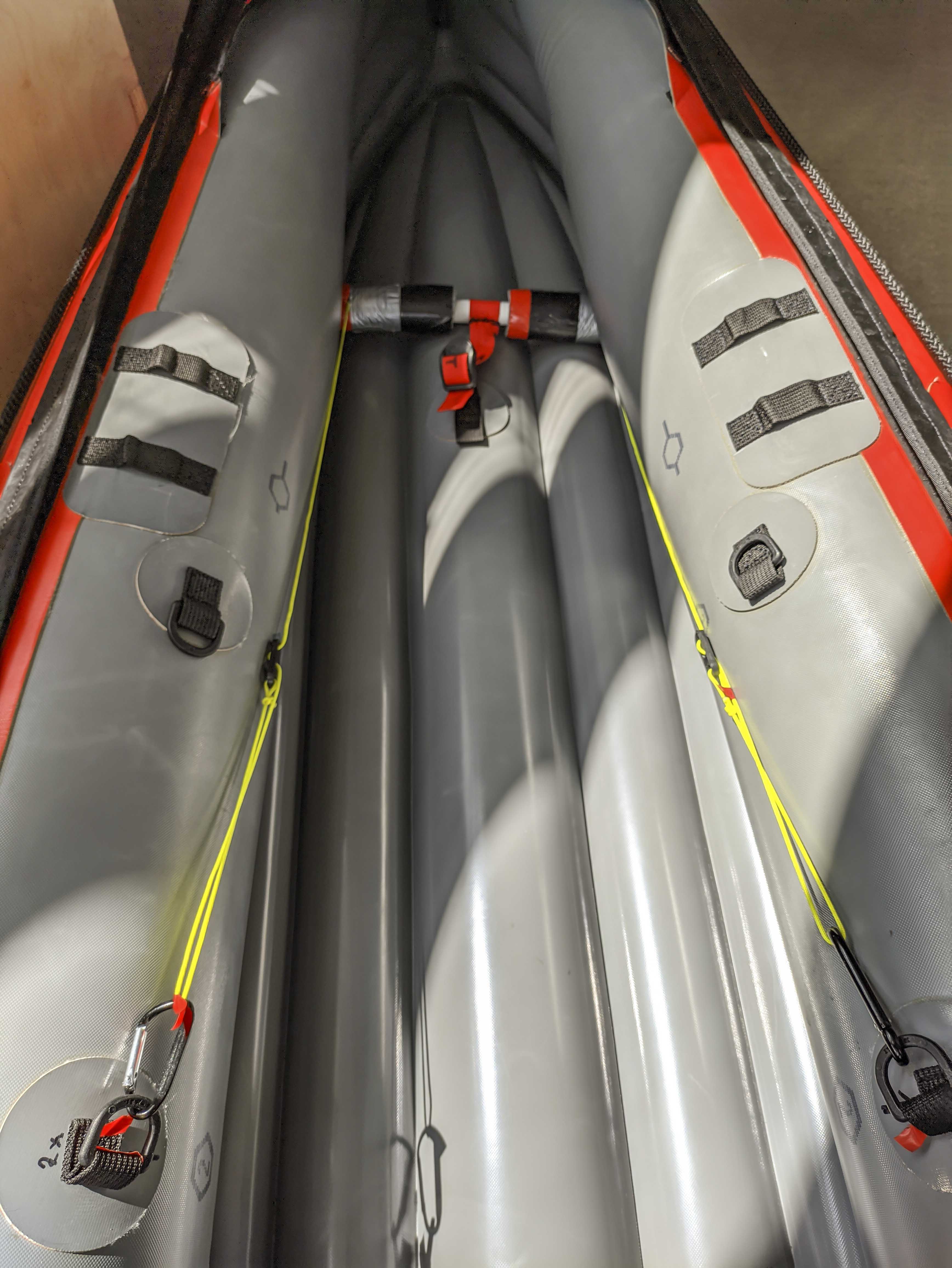 On my most recent trip I experimented with looping a couple of straps across from one side to the other around some of the attachment points, one strap near the bow and one near the stern. I then tightened the straps so that it pulled the side tubes closer together. It makes the kayak narrower, gives a slightly more pronounced keel from the floor being squeezed together, and seems to stiffen the kayak along its length as well as across its width. Obviously it takes away some stability, but I can live with that as a trade-off for being more efficient.