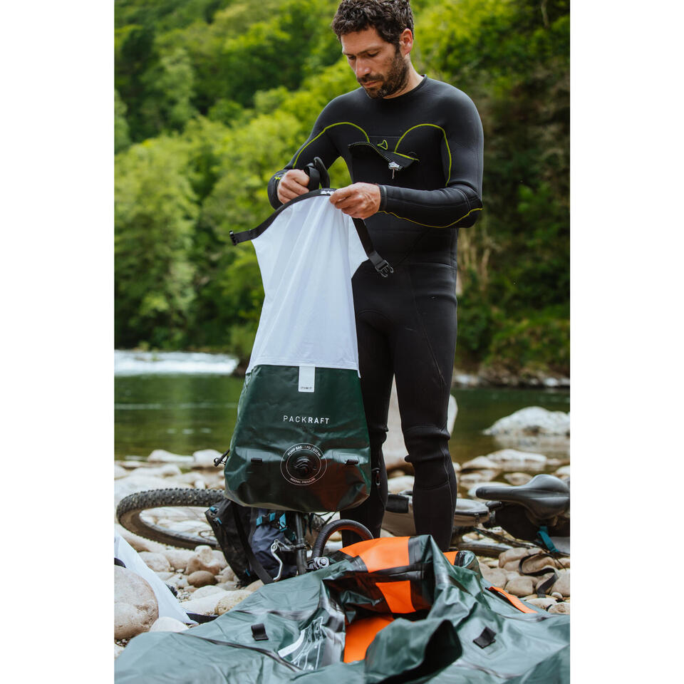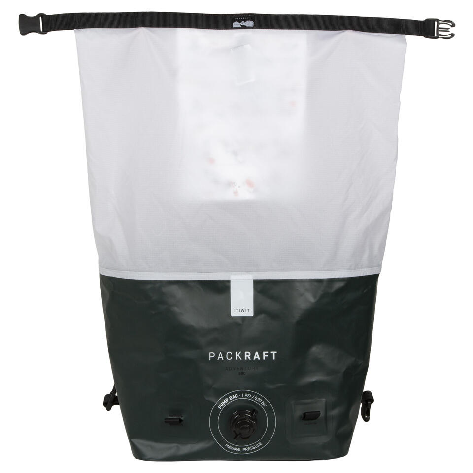 The carry bag doubles as a dry bag (like Gumotex IKs) but also works as the inflation bag via a tube. Three uses; quite clever if not weight minimalising. The packraft (and the bag?) has a regular Boston valve like Itiwit IKs, so you’d then use that tube or the boat valve to top up by mouth. Give it all you got: a firm boat responds much better on the water.