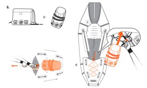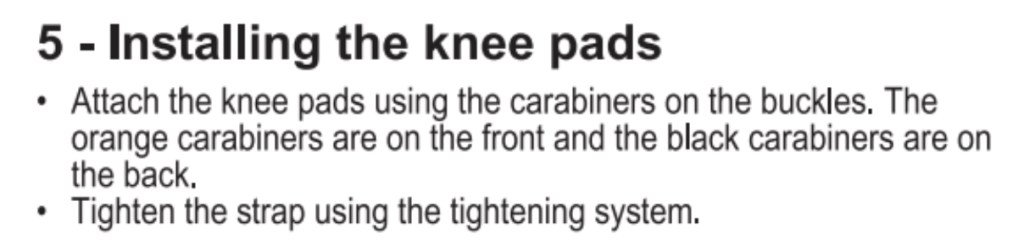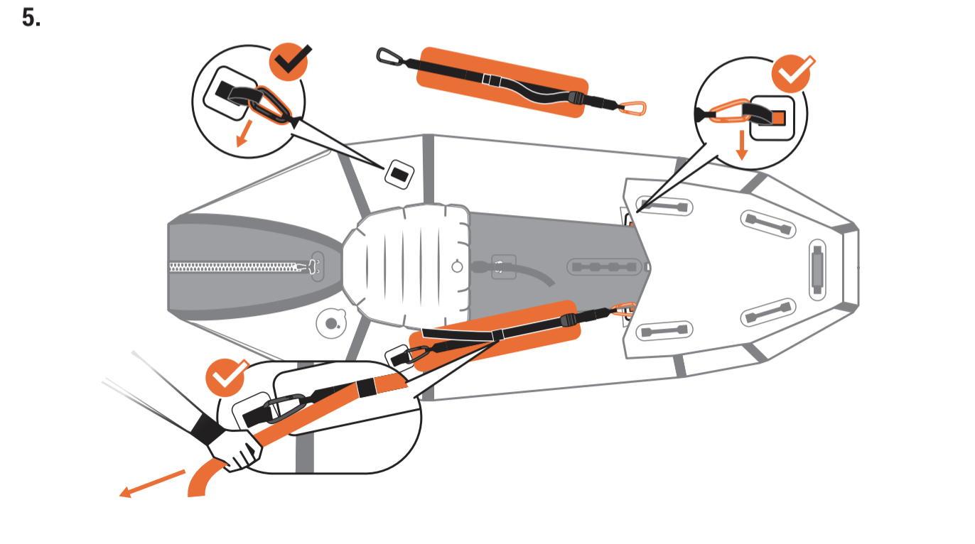 It was pointed out that the small sprung-gate snaplinks aka: karabiners (‘biners’ or ‘krabs’) used to attach the straps to the hull are an entrapment hazard. Rock climbing practice has long recommended using screw-gate (locking) krabs on the climber’s harness, even if loads of sprung-gate (open) krabs are dangling off it, attaching the gear. Below from the manual: orange krabs at the front, black by the seat. Rationale unknown, but may become so on seeing the actual boat.