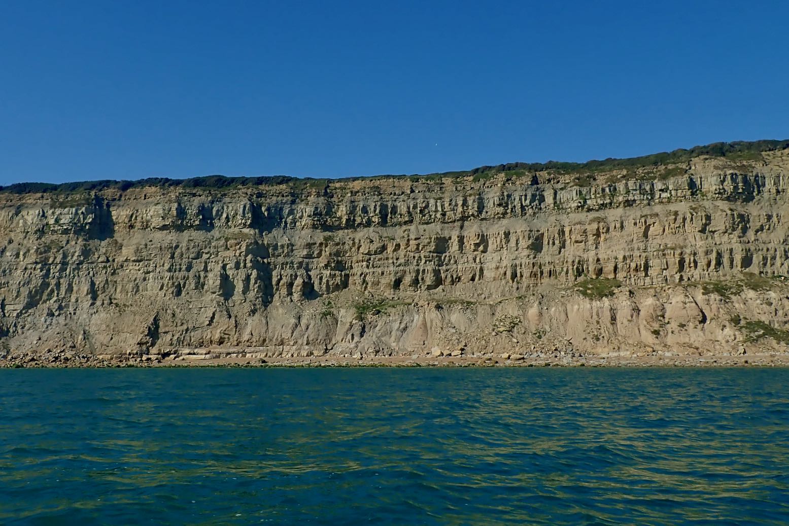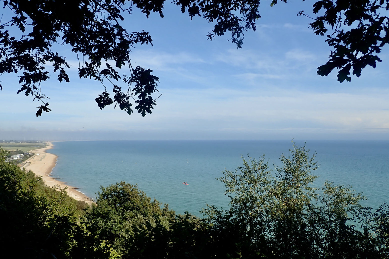 I creep along the expanse of Winchelsea Beach. It’s hot work in a backwind. Eventually I reach the start of the cliffs where the coast turns more east-west, putting the wind directly behind me. But paddling at effectively wind speed, there is no cooling effect. More familiar with paddling at the other end of Britain, I’m not used to 27°C.