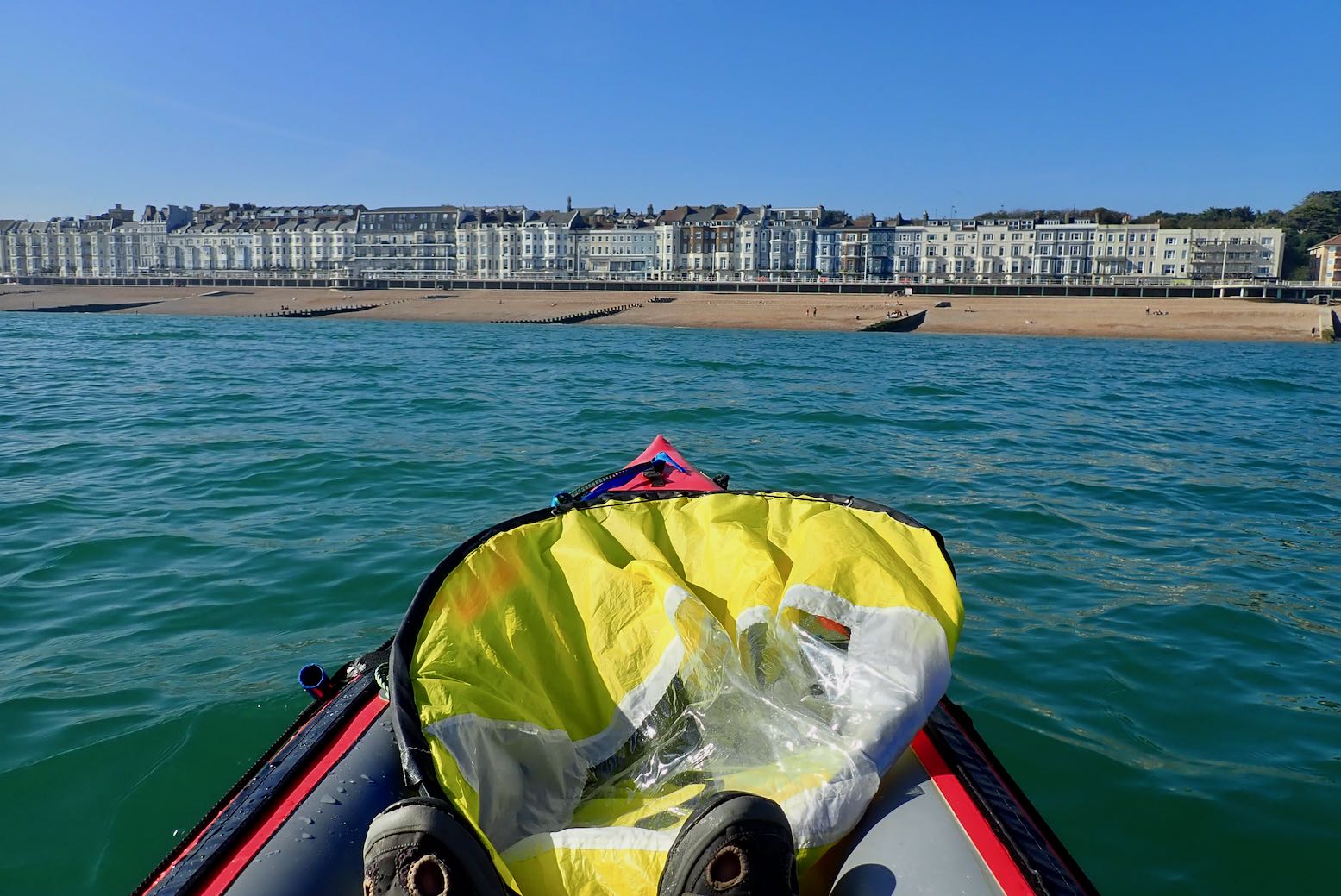 A breeze picks up so I flick up the sail. I check my GPS and am doing 3-4kph, while I can paddle at around 5-6kph. Then the breeze drops away. I wasn’t really planning to paddle the full 30+ clicks to Cooden station, but I can always get off at Hastings, a few stops before.