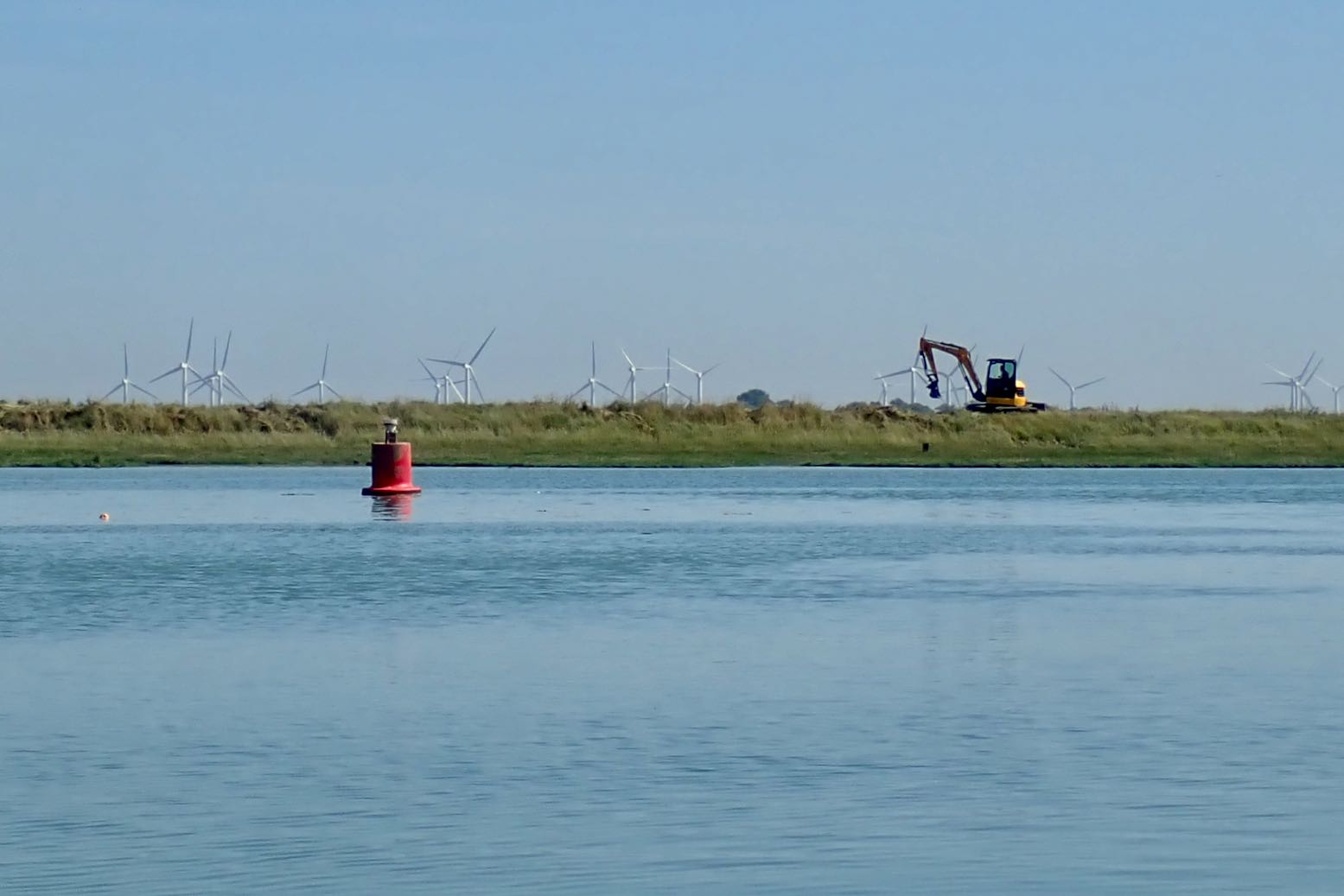I’m into the wind but the grass banks are under water and the wind turbines are spinning merrily; all good signs.