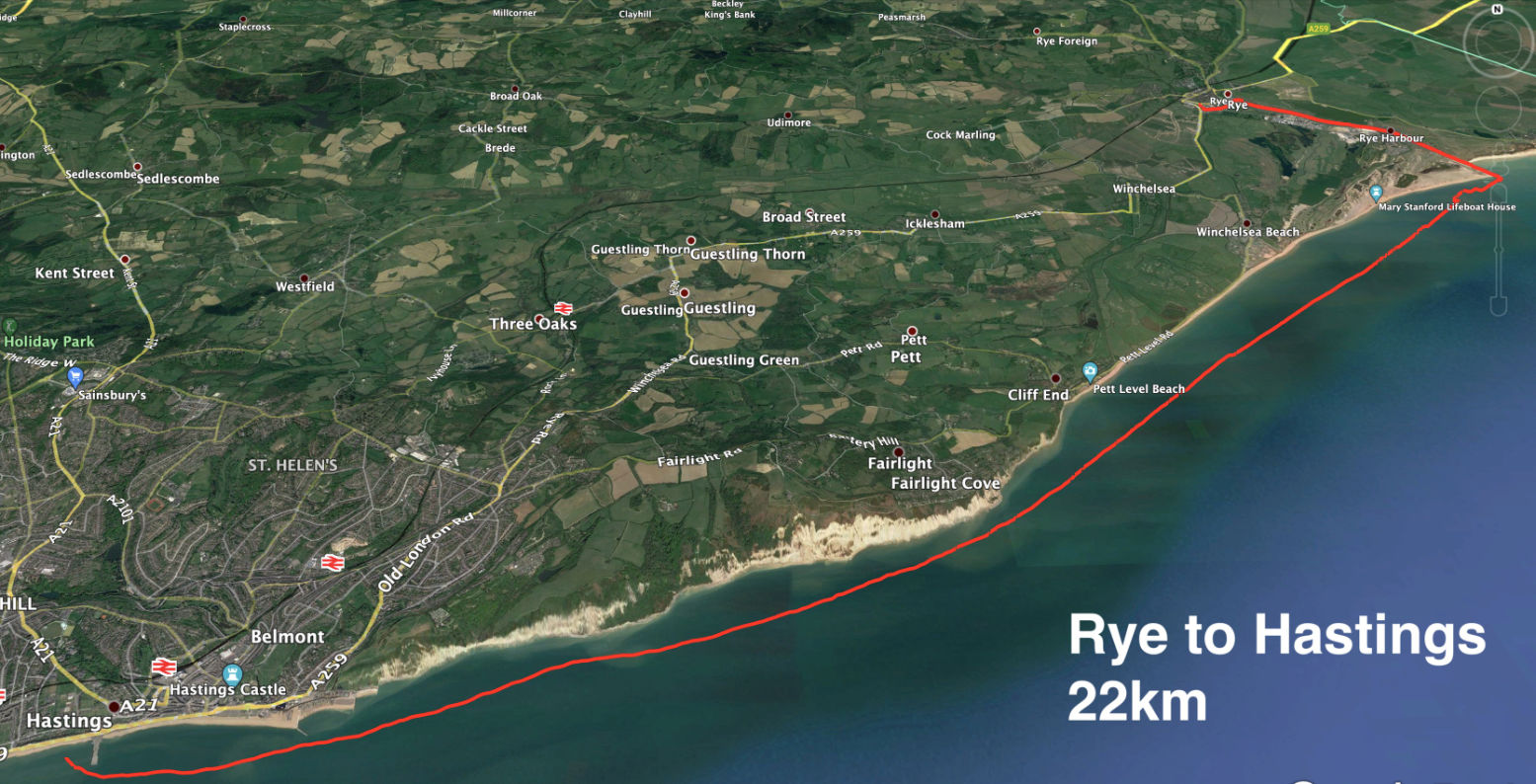 Once we were let out in the Covid summer of 2020, we did a very nice coastal walk from Hastings to Rye along the Sussex coast. Hot, but not so windy, it would have been just right for paddling. Today conditions were similar for a westbound transit from Rye back towards Hastings.