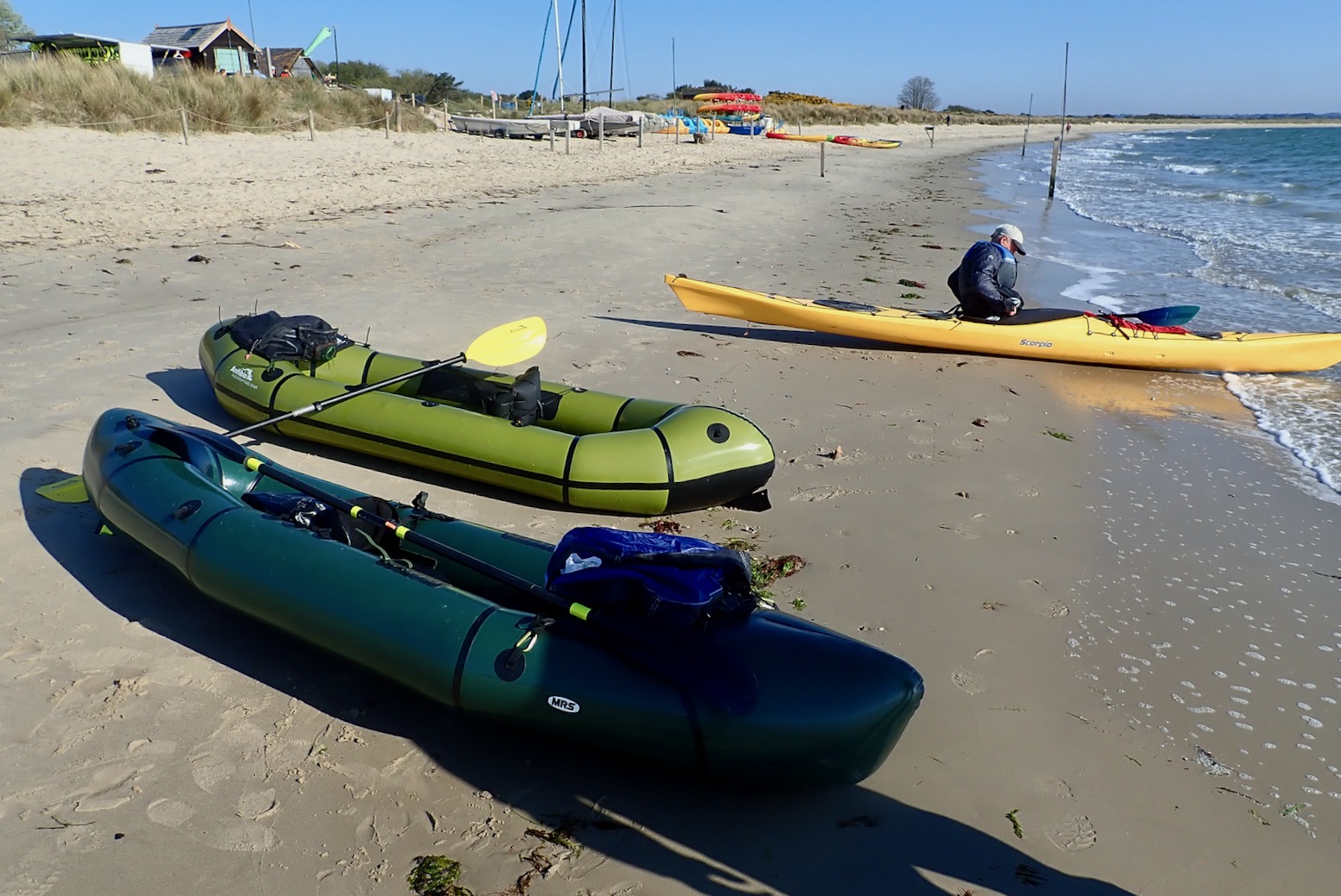 A couple of paddlechums were also up for a pre-dawn departure; Barry rode down with his similar MRS Nomad S1, while Nimbus – yet to fully embrace inflatable paddlecraft – brought his 17-foot, plastic P&H Scorpio sea kayak (left). Even at ~30 kilos, it was a proper boat for the conditions and we imagined he’d run rings round our packrafts.