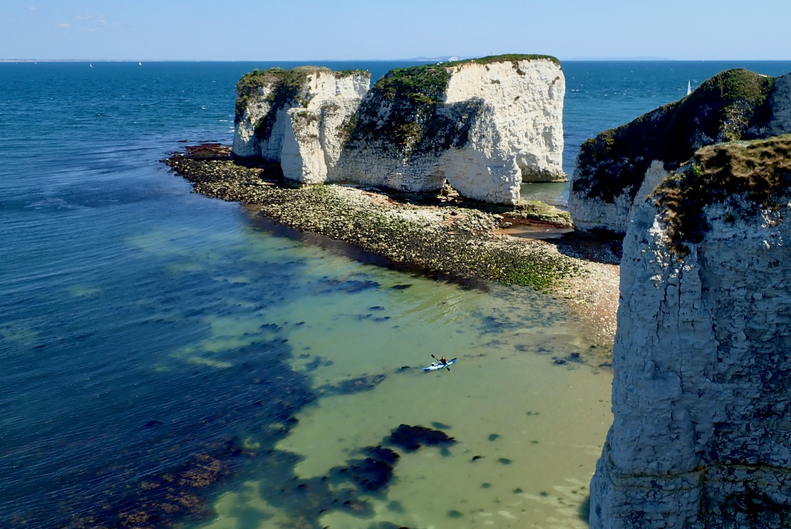 Back at Knoll Beach, Barry roared off on his motorbike while Nim and I wandered back the way we’d paddled to check out at Old Harry’s from above. The tide was now at its extended low period and the wind had swung to the southeast, sheltering Studland Bay. Down below, a lone kayaker was just setting off.