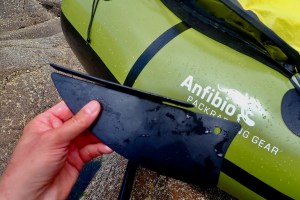 Once through, it was a bit more wavy and at Ristol beach I hopped out to fit the front skeg, curved edge forward, as well as the WindPaddle sail on the off chance the breeze might pick up. Then I gave the floor and boat a top-up until it was all pinging like a drum. Had I looked more closely at the skegs on the upturned boat (below), I may have guessed what the problem was going to be. The TXL’s bow and stern are symmetrical, fyi, and both patches are glued in identical positions.