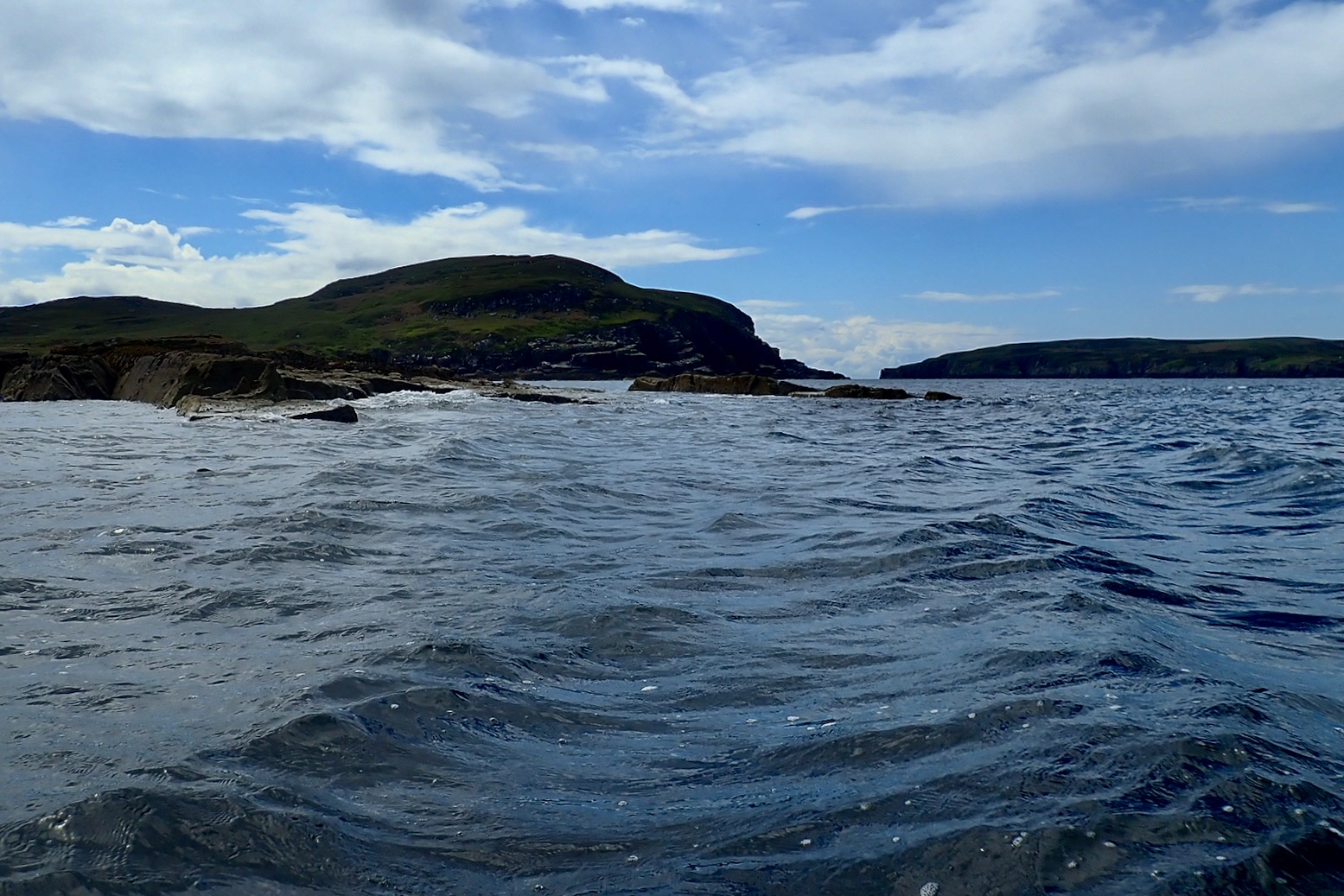 Setting off into the wind to carry on round the spit and down the back of Isle Ristol, tracking felt a bit worse, then really became a handful once I turned southwest across the small bay filled with clapotis bouncing off the cliffs.