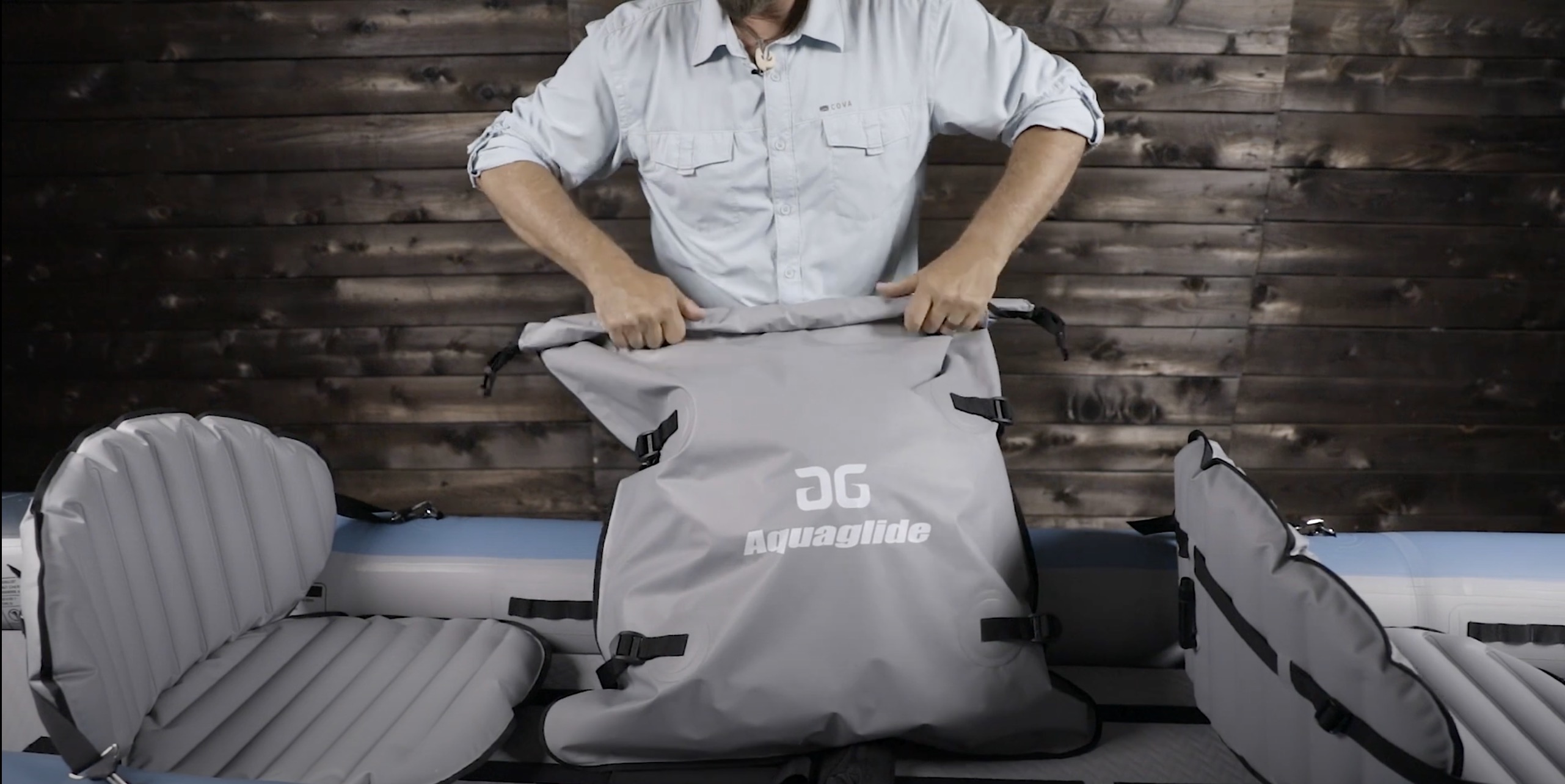 Unlike the Chelan, there appear to be no ‘have-your-cake-and-eat-it’ closeable self-bailing ports which I suspect have dubious value outside of white water paddling to which a 15-foot IK is ill suited. You just get the usual drain port in the back when flipping the boat over will achieve the same purpose. The floor is removable too according to a video comment; a huge benefit for quick rinsing, drying and cleaning. And we’re told the whole boat fits into the shoulder drybag as pictured below.