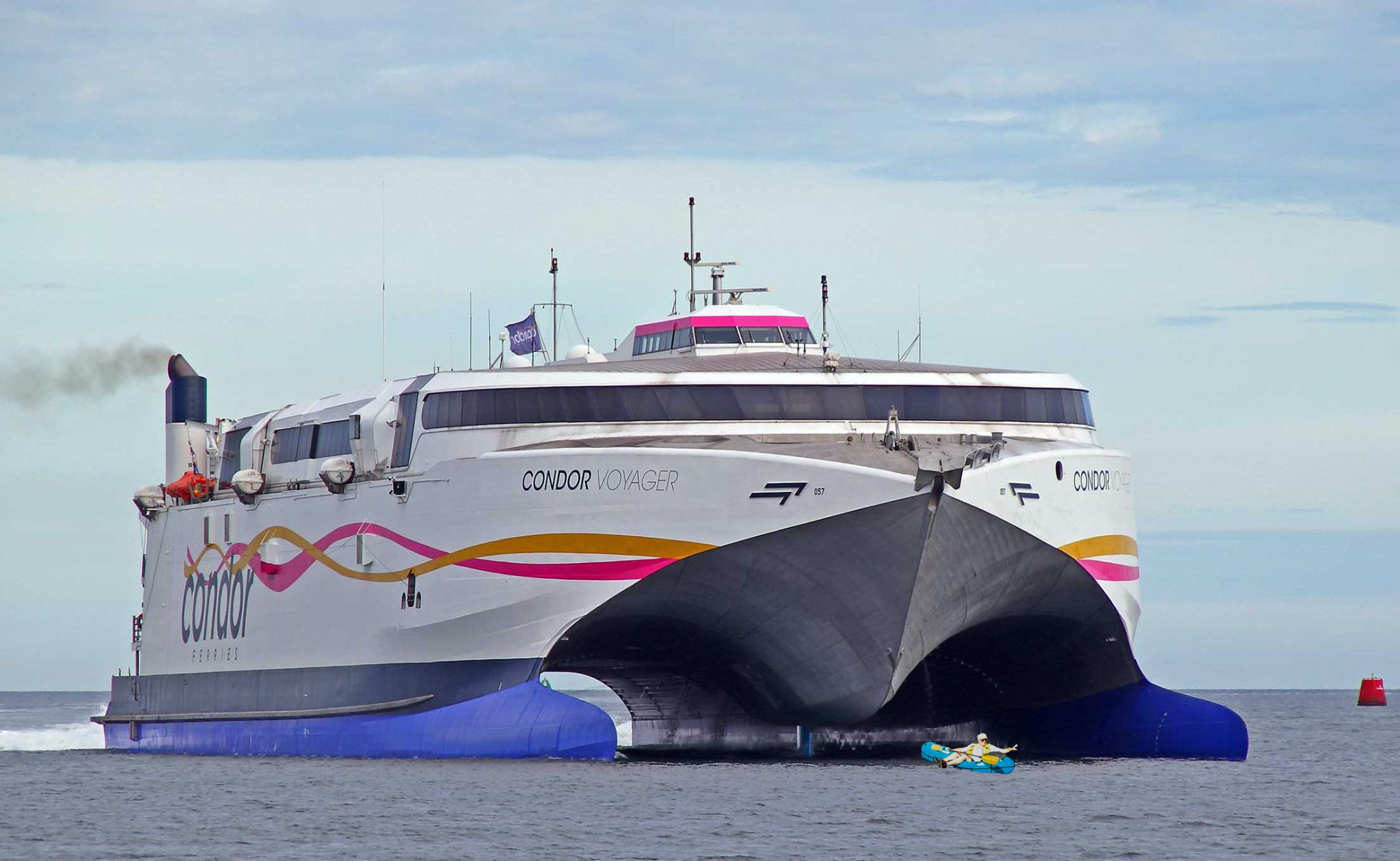 My route would take me right past the ferry berth where getting in the way of a gigantic ferry would probably raise a yellow card. Again, on PWC I was able to see today’s main ferry movements: the massive Condor Voyager cheesecutter class twin hull (above) would depart for St Malo at 14.15. I’d probably be an hour behind.