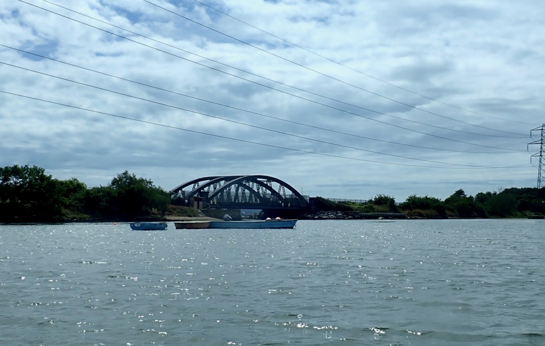 A headwind was blowing quite hard, but it was only 500m to the rail bridge narrows, after which I’d turn southeast to pick up what wind I could get. Setting off, the TXL+ felt like it was zipping along as wind and waves rushed past. Up to 6kph, according to the GPS as I neared the narrows. That was probably an unseen back eddy sucking me into the gap, because as I got nearer I could see a current ripping through under the bridge at at least the same speed or more. I powered in hard along the edge, like we’d done at Hayling, but could only manage 0kph.