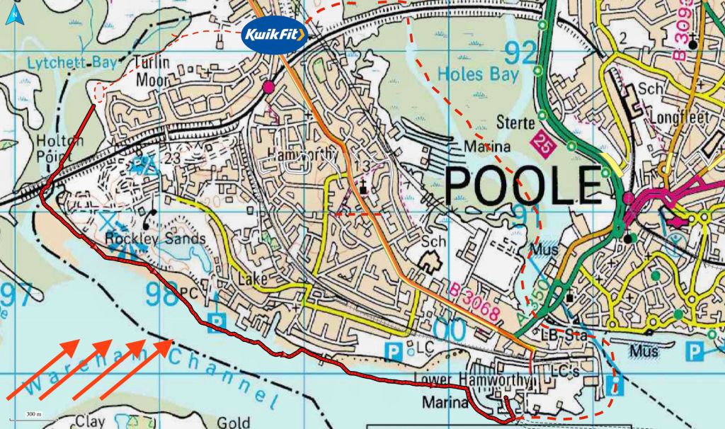 This route – out one tidal channel and in via another – had similarities with our lap around Hayling Island a few years back in the Seawave. On that occasion we had to go full steam against the incoming tide to get out of Langstone Harbour back into the Solent to close the loop. This Poole loop would only require a 500-m walk from Holes Bay shore back to Kwik-Fit.