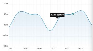 I’d swum half a mile that morning which can be enough exercise for one day. Paddling under the bridge was like doing 50 pull-ups and I was a bit pooped. I looked later at the state of the tide at that precise time (left) and saw I’d been about an hour early.