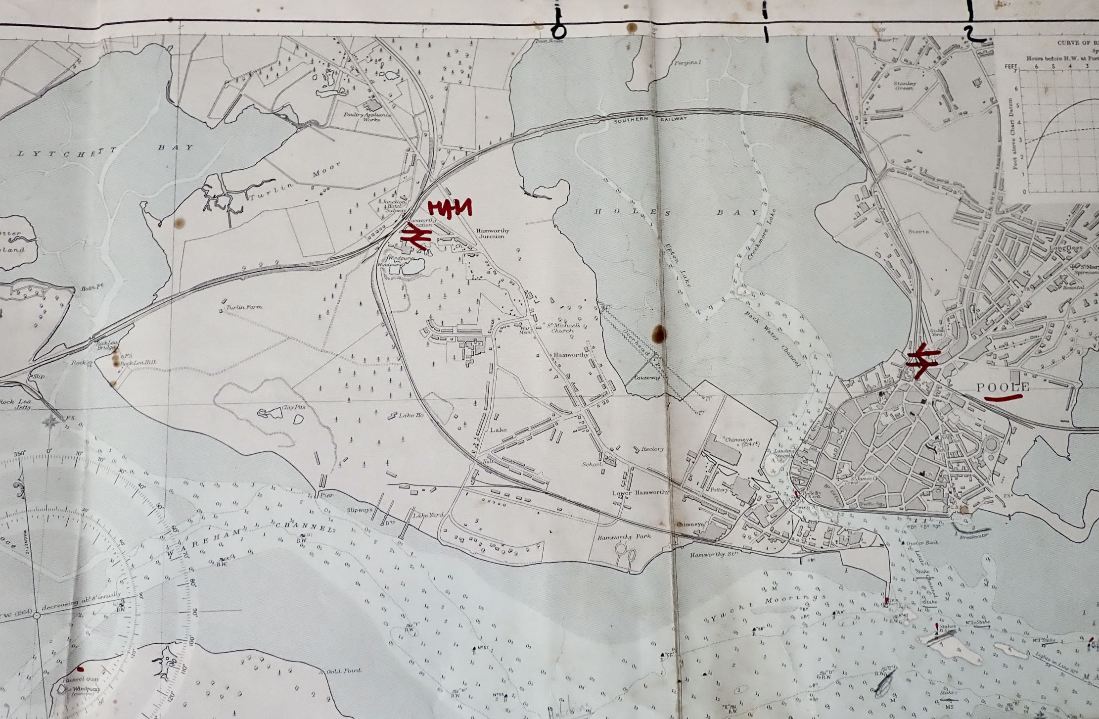 Looking back at the tide graphs for Poole Harbour, it seems that at the lowest neap tides (as it was two days later), there can be a 7 hour period when the high tide flattens off and rises then falls more than 20cm. That would be the best time to try and paddle around Hamworthy between Lytchett and Holes Bay. It could also be fun to leave Holes Bay on an ebbing spring tide to get a good blast under the rail bridge narrows, down the channel through downtown Poole and out into the harbour.