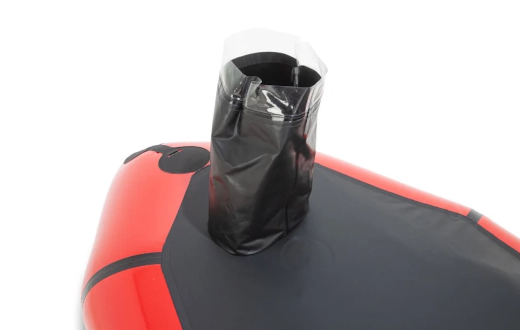 The single colour TXLB+ is just like my blue boat with optional thigh straps, floor matt, strap attachments and massive and secure TubeBag storage, but with the roll-up self-bailing drain hose we first saw on the 2022 Revo white water packraft. I never got to test that system properly, but the principle of flowing water sucking the swill out sounds plausible. As it is, you’ll be up dry on a floor and seat anyway, so it’ll take a lot of splashing to swamp the boat.