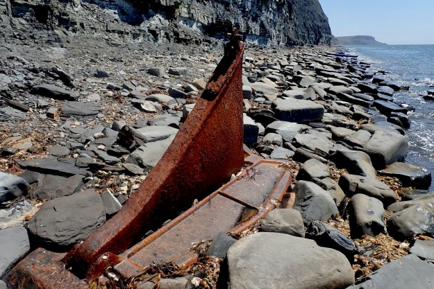 There is the rusty triangular ‘skeg’ (also below) sticking up. This is actually called Clavell’s Hard and studying Ian West’s page for this area, I think the object (below) may have been something to do with oil shale mining right here in the 1890. There’s a semi-naked castaway looking for treasure. I hope he knows how to get back.
