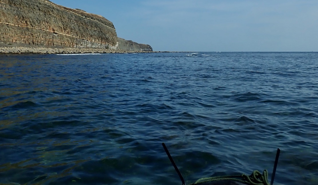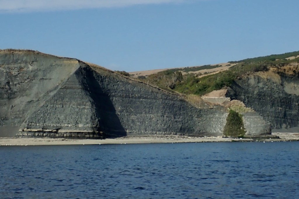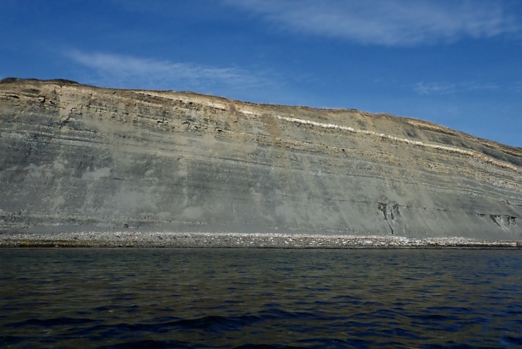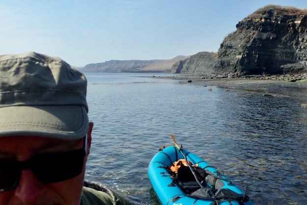 The soft, shaly grey cliffs, rich with ancient marine remnants.Four colourful kayakers close to shore, like I should be. There’s more to see there.I pass what could be Punta Pliosaurus.