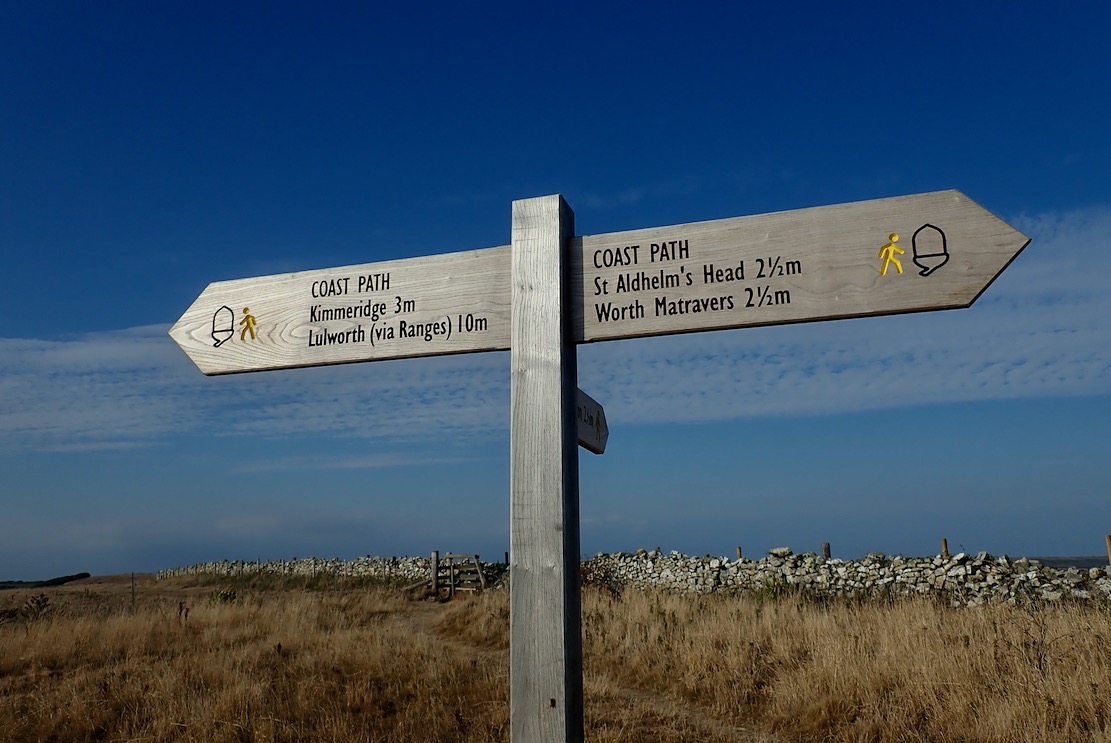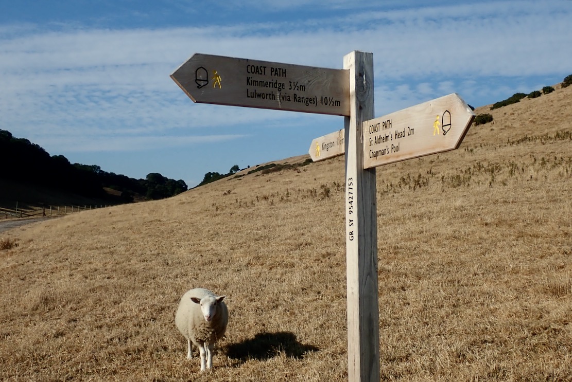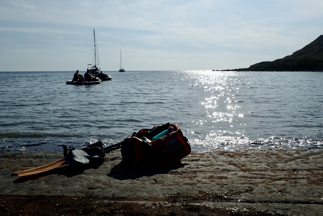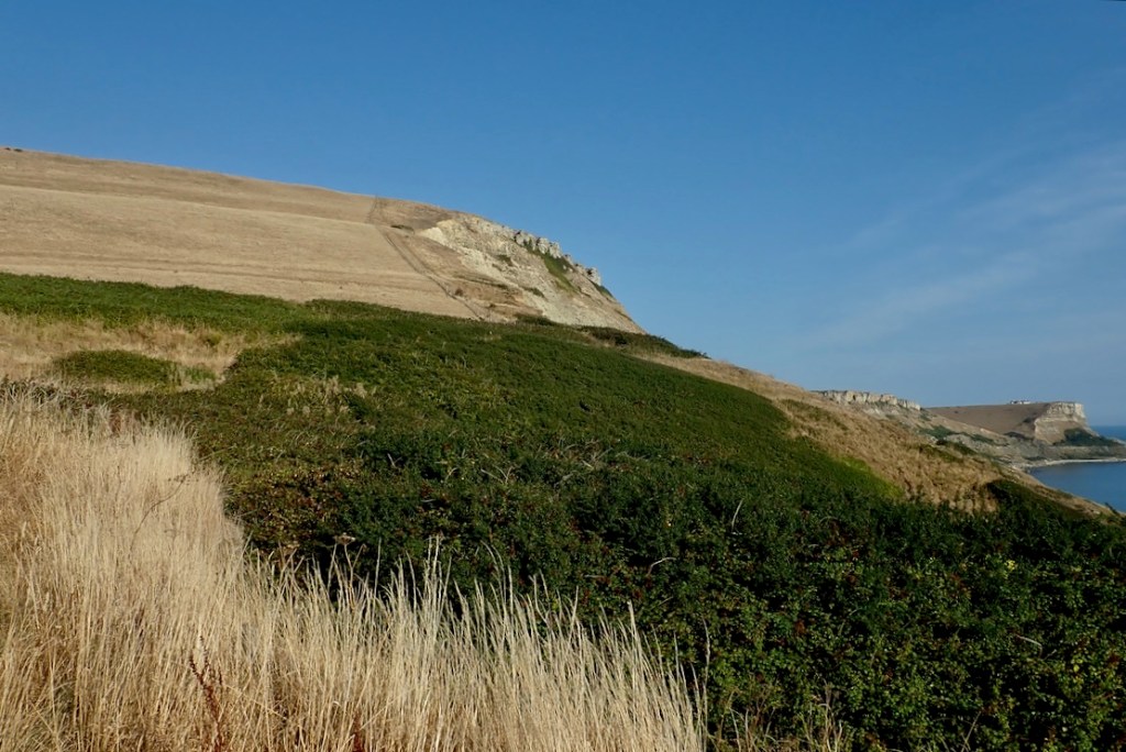 Along with some moored yachts and beach bathers is a trio of menacing jetskiers playing their satanic music. But this is Purbeck so it’s not blaring, and at least they weren’t tearing up the Pool like houns en tout.At Chapman’s there are ammonite fossils everywhere you step.Even getting off the beach by the waterfall is a loose scramble, especially backpacking a holdall. As I leave, I hear the jets gun off to Kimmeridge or Swanage. I presume that’s what they did as you can’t get a trailer down here. With a packraft you can go anywhere you can walk.Up the steep, overgrown gully and across the parched field for the 500-foot climb up to Houns-tout hill – all in less than a mile from the shore. My pulse hits the rev limiter. What does Houns-tout even mean?Kimmeridge 3 miles. In these shoes? No way, Jose.