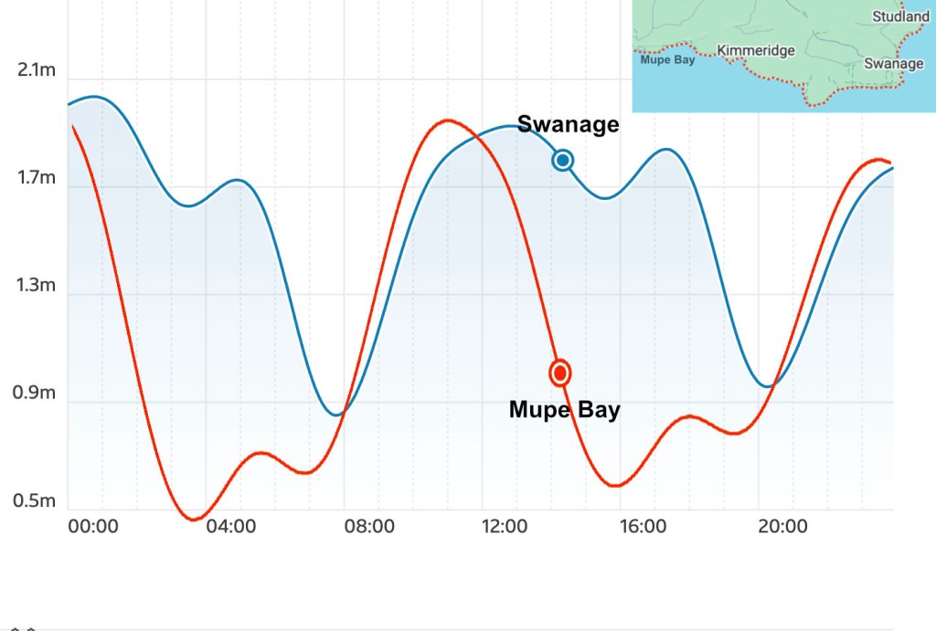 I packed a paddle in my pack and rode down to Kimmeridge Bay.At Kimmeridge Bay’s massive car park field, bikes are only £1.20, but it’s a choka bank holiday weekend so I hope the lad at the pay shed was on a percentage today. I asked him about tides which have been doing my under-stimulated brain in. ‘Err, there’s a board over there’ said laddy. At last, the Kimmeridge Question was solved, I thought, admiring the first apostrophe, but sighing at the second. It turned out the board lazily repeated UKHO Mupe Bay/Lulworth Cove timings, about 5 miles west. You’d think that would be adequate for an estimate, but not necessarily.I’m still baffled by the tides on Purbeck’s eastern Jurassic Coast. The problem is getting reliable times for Kimmeridge Bay or Chapman’s Pool, the most useful put-ins hereabouts, and timings matter the longer you’re on the water. The UKHO posts times for Mupe Bay and also Lulworth Cove which is less than a mile away. The times are identical. And then there’s nothing until Swanage, about 12 miles to the east as the black-tipped tern flies and a doable day’s paddle in a long boat. Such gaps in UKHO stations are fairly normal along the UK coast, and you’d think just estimating Mupe Bay ± ~30 mins will give a time for Kimmeridge. But around here the tidosphere is all warped. Above, a few days before neap tide, it looks like Swanage rises in synch with Mupe and then ‘holds on’ to HW for hours, before dumping five hours ‘late’.And then I found this Insta post (above) from Sharon Lee in Brighton who makes tide times posters. But not for Kimmeridge because, as she observes: ‘Notice an arc of weirdness around Dorset? That’s an amphidromic point. Which basically means the tides around Dorset (particularly the Isles of Purbeck and Portland) are utterly mad.’ Amphidromic (or a tidal node) was a new one on me, but may explain the Mupe-Swanage Incongruity (MSI), as tidal philosophers have called it since Pytheas skimmed pebbles with Posidonius. You’ll find many tide times websites supposedly offering times for non-UKHO locations, but many just list the nearest UKHO location with no real-world adjustment. As unless I am over-thinking it, Mupe Bay to Swanage needs quite a bit of Amphidromic adjustment. And while I have your attention, what is the point of UKHO listing identical times for Lulworth Cove and Mupe Bay, just a mile apart? Is it because one is civilian-touristy and the other military most days of the year? So what? Yes, there are no less than four UKHO tidal locations in western Poole Harbour (+ Wareham) as closely bunched, but it’s a busy area that drains out to mud flats at low water and the timings are all different.Mysterious tidal nodes appear all over the world. They are the Black Holes of the Oceans; go there and nothing happens. Spooky. Source Then I saw in Kimmeridge’s Etches Fossil Museum shop a locally published tide tables booklet. ‘… West Dorset’ said the cover, but ‘Covers the coast from Swanage, Dorset through to Salcombe, East Devon‘ claimed the shop’s online blurb. The publisher’s website said as much (… the whole of the Dorset and South Devon coast…). Not in the copy I bought. The tables give every day of the published year, but only for Exmouth, Lyme and Portland. There’s nothing east of Portland in the booklet, unless you include a spot check on Portsmouth or Dover. No mention of Swanage, Lulworth or other local adjustments for Purbeck. You’d think I’d not be the first to notice this, I’d have saved my money for two more moto parkings were it not for chappy behind the shop counter advising: add an hour to Portland for BST, then 15-25 minutesfor Kimmeridge. It’s Portland’s sticky out Bill that puts a spanner in Purbeck’s tidal flow, he explained. The formula was not Mupe Bay ± 30 minutes, as I’d guesstimated, but Portland + 15-25. I coughed up my £2.50 as an offering for this handy tip – I’ll appreciate it and the booklet when AI implodes the internet. But hold your paddles, there’s more! Also on the Etches website I found a link to Willy Weather with a page for Kimmeridge Bay that wasn’t just a paste from Mupe Bay, but believably adjusted times. I compared KB times many months in the future using the Portland booklet formula and Willy, and found them to be within 3-13 minutes of each other. Assuming both are broadly correct, that will do me. Willy don’t list Chapman’s Pool but do have adjacent Egmont Point which seems to be KB + 2 minutes. I’d heard of Willy Weather, but it wasn’t in my tidal bookmarks. It is now.Still reading? At the jetty by the Wild Seas Centre a pair of well prepared sea anglers were setting out in their double outrigger SoTs. Talking of gear, this is a proper sea paddle so I’m in my proper Kokatat Leviathan pfd, but it feels like wearing a folded tractor inner tube full of ice cream. Leviathan – it’s in the name. At least I won’t be too gear-shamed when the RNLI fish me out by my ear and shake me dry.I head out of the Bay and turn east. Oh MG, breaking offshore waves already! But I needn’t have worried today. There were a few more later on, but nothing the TXL+ couldn’t ride out. I actually think tackling this stage with a rising tide flooding the Ledges is the way to do it (in either direction), as any waves will diminish as the ledges submerge – won’t they? It’s more down to the wind of which there was little today, but as you paddle along you still want to glance offshore once in a while in case you’ve gotten on the inside of a building wave which can pop up out anytime, any place, any where. This is why I stayed quite far out. Not normally what I like to do alone in a packraft.