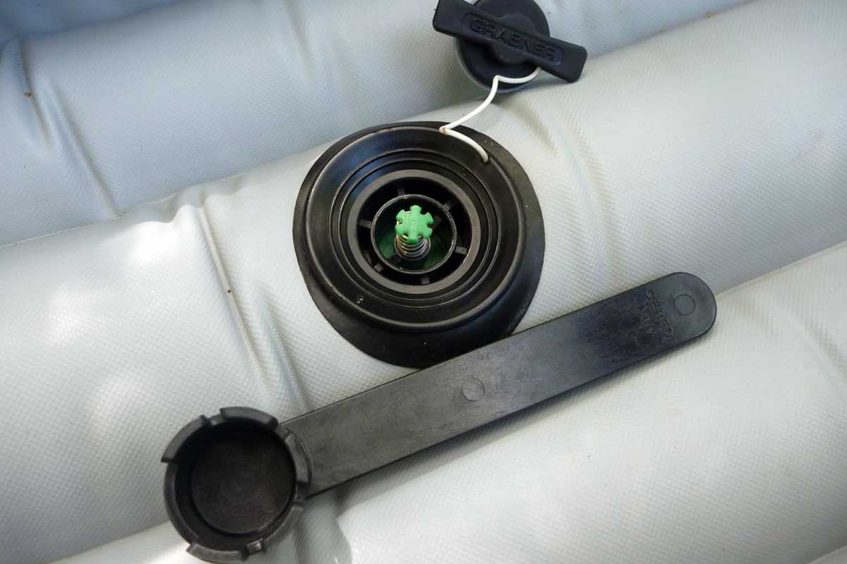 is for valves. Proper one-way IK valves are the same as those used on commercial whitewater rafts, but may require occasional tightening into the hull fabric with a special tool (left). I’ve never had a valve malfunction but am always careful to replace the valve cap to keep grit out of the mechanism.